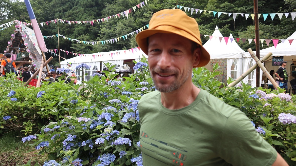 ドイツ出身のベンジャミンさん(44歳)は、現在暮らしている香港から『フジロック』のために来日したそうで、「金曜の夜に香港から羽田に来て、ここには土曜に着きました。チケットをTicketflippingで買ったら駐車券を一緒に買えなくて。だから電車で来ることにしましたが、トラブルもなくスムーズに来れました。宿泊先は越後湯沢駅近くの旅館で、シャトルバス乗り場からも近く大変便利」とのこと。『フジロック』について尋ねると、「初めて来ましたが、快晴で雨もないし、フードのクオリティも高い。とても楽しんでいます」と満足顔。