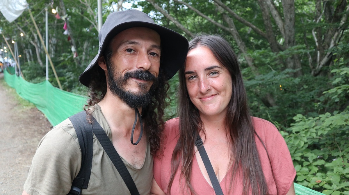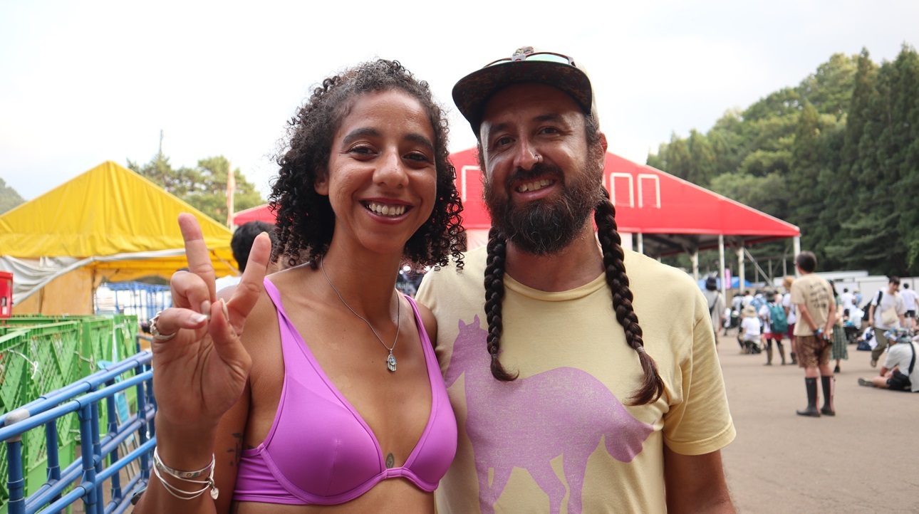 ワシントンD.C.からやって来たハビバさん(38歳)とフーゴさん(41歳)夫妻。「今回初めて来ましたが、『フジロック』は素晴らしいフェスね。いいバンドがたくさん出るし、価格もリーズナブル。フードは美味しいし、自然は豊か。たくさん歩いていい運動になるから、とってもいい時間を過ごしているわ」と語るのはハビバさん。アーティストについては、「SUDAN ARCHIVES、ALANIS MORISSETTE、FOO FIGHTERS、北海道から来てたOKI DUB AINU BANDを観たわ。歩きながら出逢う、それまで知らなかったたくさんのバンドの音を聴いて、新たな発見を楽しんでいるの」とニッコリ。