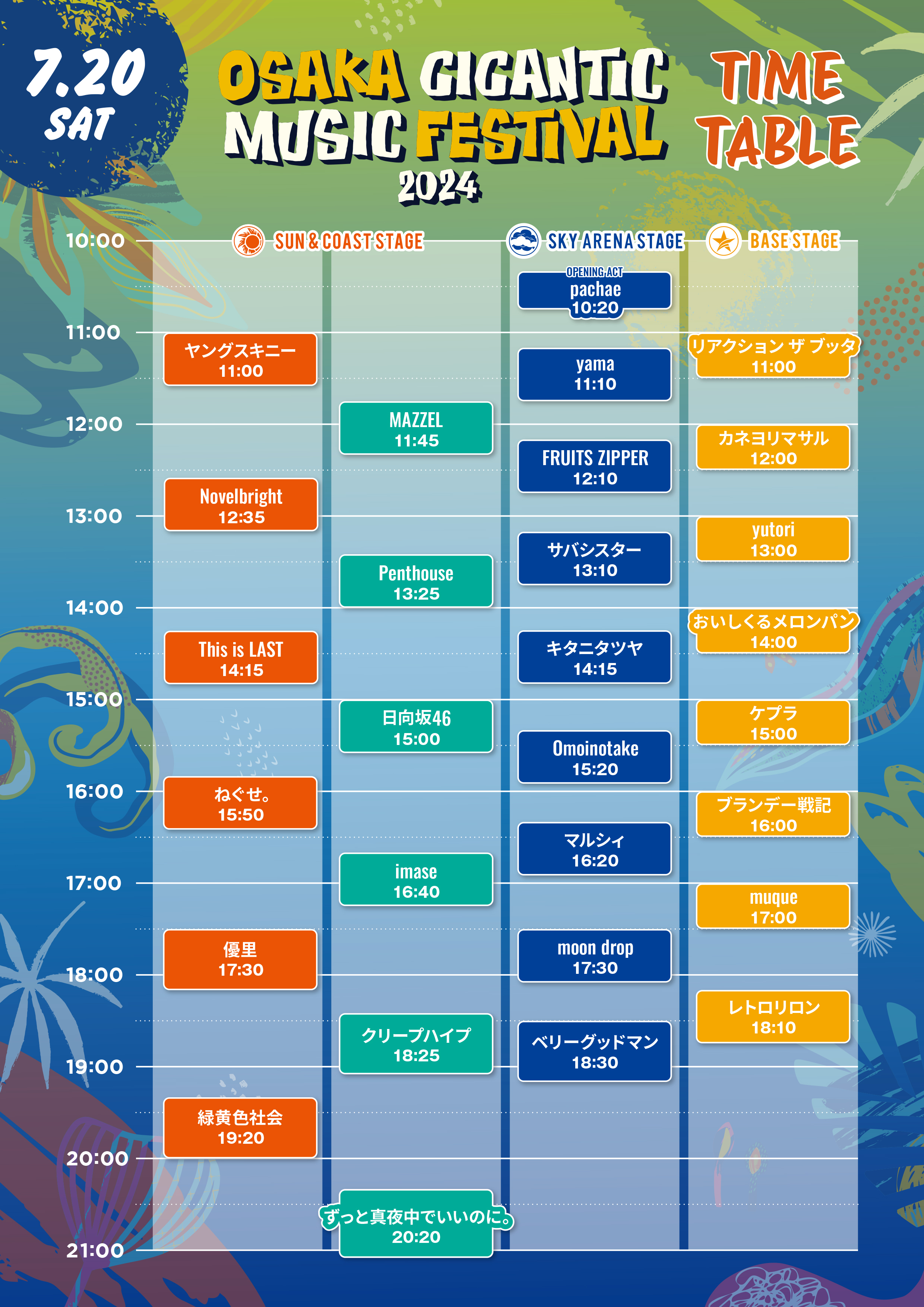 オープニングアクトはSKY ARENA STAGEで10:20から20日(土)pachae、21日(月)Awkmiu。