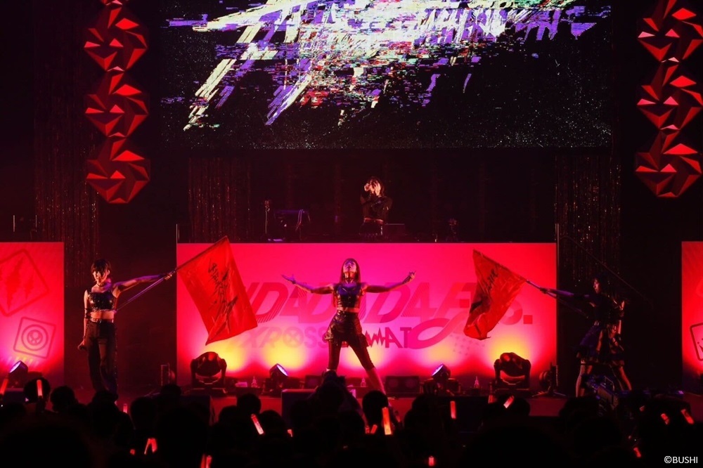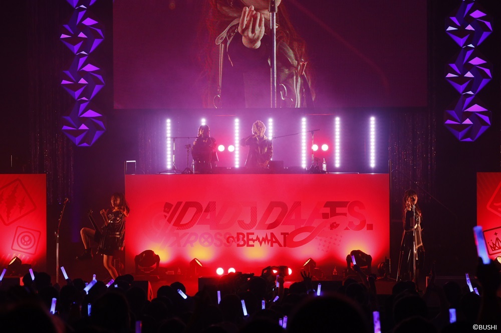 「創傷イノセンス」、「撲殺天使ドクロちゃん」、「Shiny Smily Story」、「adrenaline!!!」、「私、アイドル宣言」と5曲続けてのメドレーの中にも、スクラッチ入れたり、DJミキサーのエフェクターを組み合わせたり、サンプラーを叩いたり、巧みに繋ぎつつ「みんなタオル持って!一緒に振り回そう!」とマイクを挟み、盛り上げるのも忘れない。