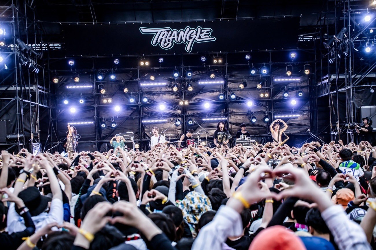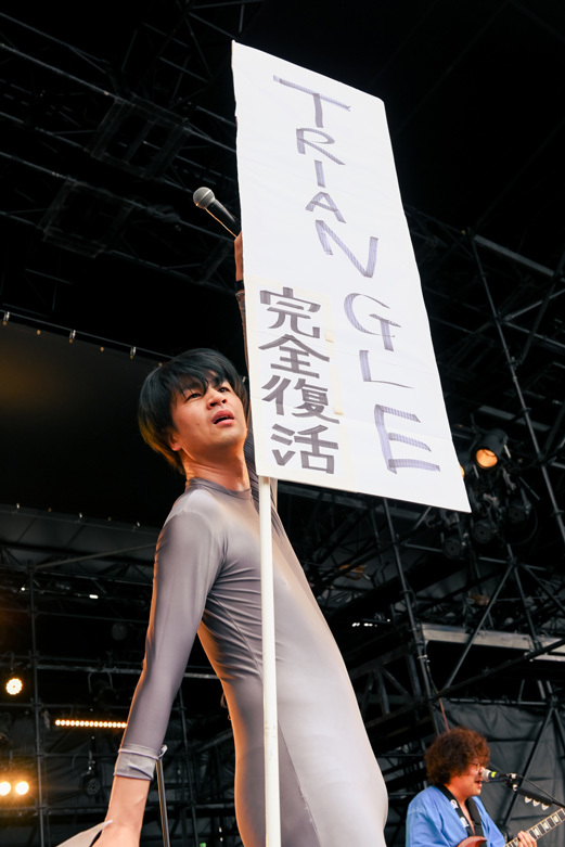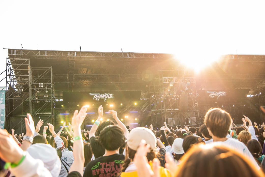 「『TRIANGLE』2日目が素晴らしいものになると信じております!」。かりゆし58は野外での『TRIANGLE』は初出演だが、観客のご機嫌スイッチを探り当てるのがとにかく早かった。1曲目「ホームゲーム」からあっという間にピースフルな空気を開場に広めていく。母親への想いを綴った名曲「アンマー」では共に口ずさむ人がとにかく多くて、楽曲がずっと長く愛され続けてきたことを改めて思い知る。ラスト「オワリはじまり」では風が、太陽が、砂浜が、すべてのシチュエーションが楽曲をより魅力的にし、忘れられない唯一無二のステージを作り上げていた。