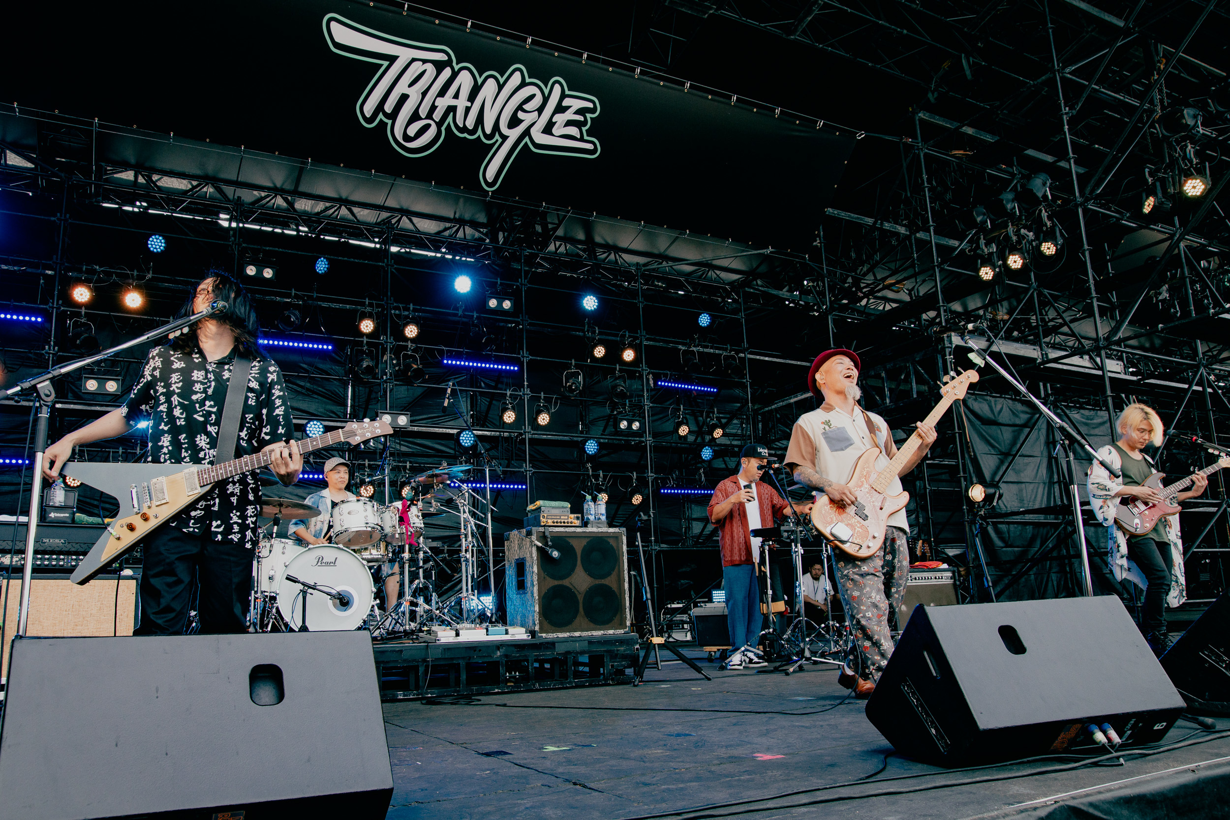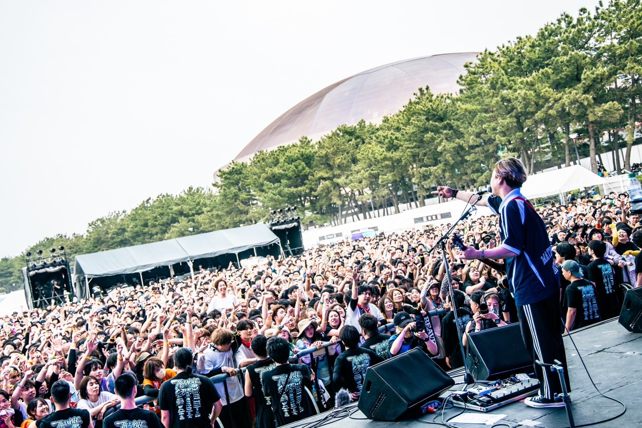 観客の歓声もハンズクラップも笑顔でダイブしていくキッズの人数も、砂嵐も。ひときわ規模のデカい反応が沸き起こっていたのがHEY-SMITH。「Be The One」「Living In My Skin」と、突き抜けるホーン、タフなビート、キラーチューンの連発に感情も体も大忙しだ。「お前の声を福岡中に響かせろ!」、シンガロングが沸き起こる「California」は夕暮れのビーチの心地よさも相まって、はちゃめちゃに気持ちがいい! 「『TRIANGLE』の火はずっと燃え続けたまんまやったね。九州のバンドがトリを務める、素晴らしさを最後まで見届けたい。みんなで思い出一個作っちゃいますか!」と、ひと足早いサマーチューン「Summer Breeze」など最後の一音を出し切るその瞬間まで、観客の感情を引っ張り上げていく。