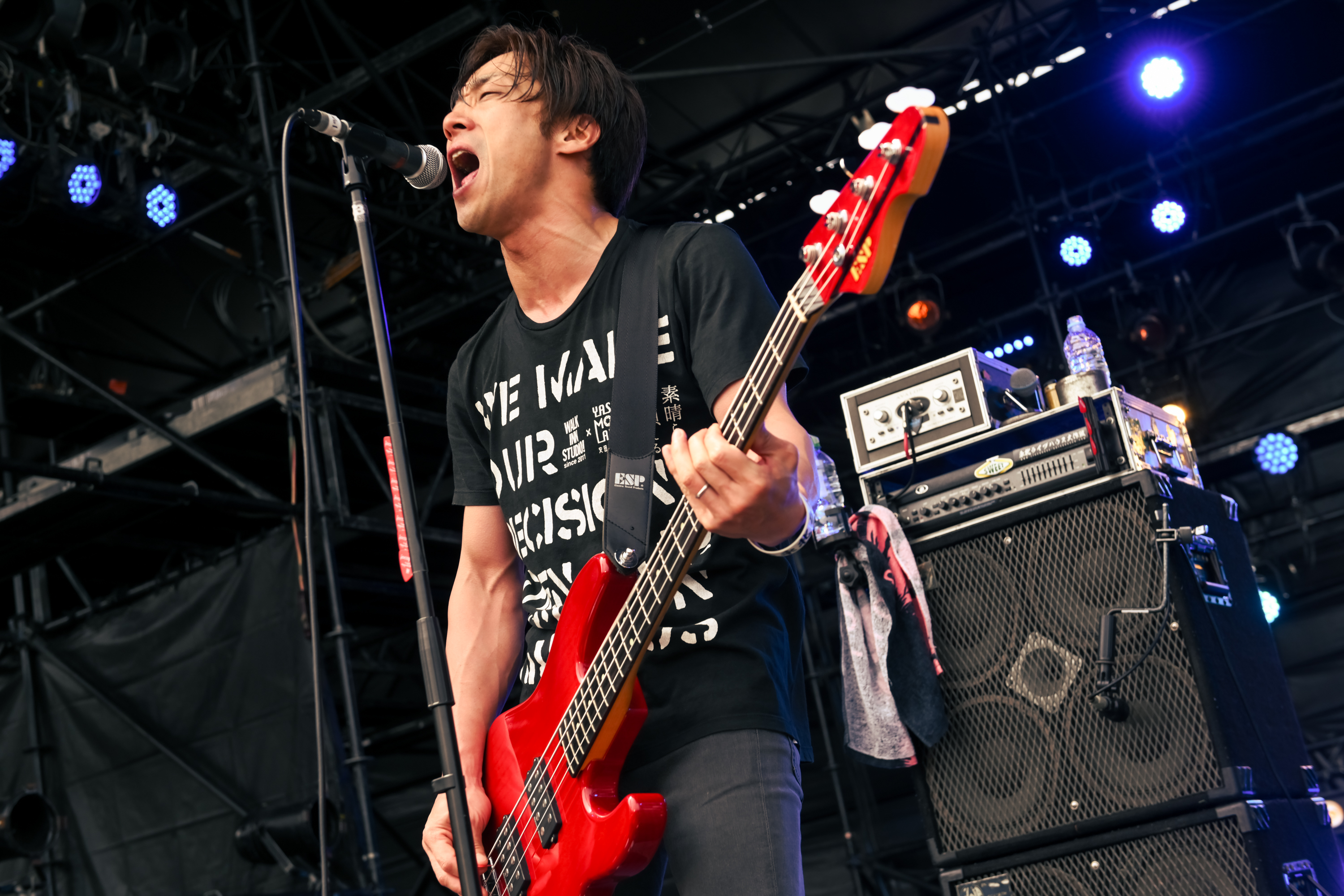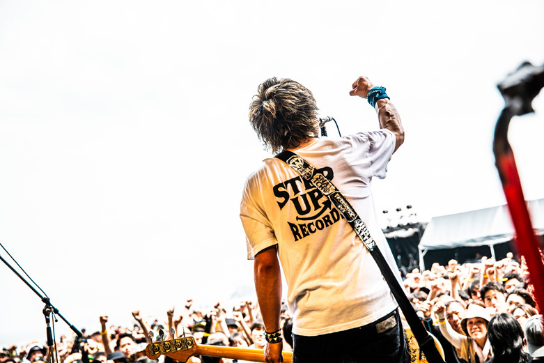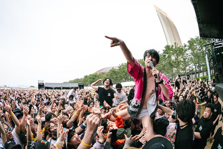 HAWAIIAN6は1曲目「Burn」から熱量高いパフォーマンスで突き進んでいく。「いつもと一緒で構わない。ルール全部ぶっ壊せ! 愛とマナーがありゃいいんだよ!」、その言葉通り、野外なのに濃密なライブ展開はライブハウスそのもの。「数字が決め手じゃない。デカイフェスに出るのがえらいんじゃない。あなたの目で見てカッコ良いと思ったら、それが一番カッコ良い。ライブハウスを楽しんで。お前らの街に行くのはそういう理由、また会おう。一生青春だ、終わらない青春なんだ」。ただただ武骨に、目の前の観客に音を届けるのみ。誰もがニッコニコの笑顔でダイブして、拳を突き上げているその姿こそ、相思相愛の証拠だ。