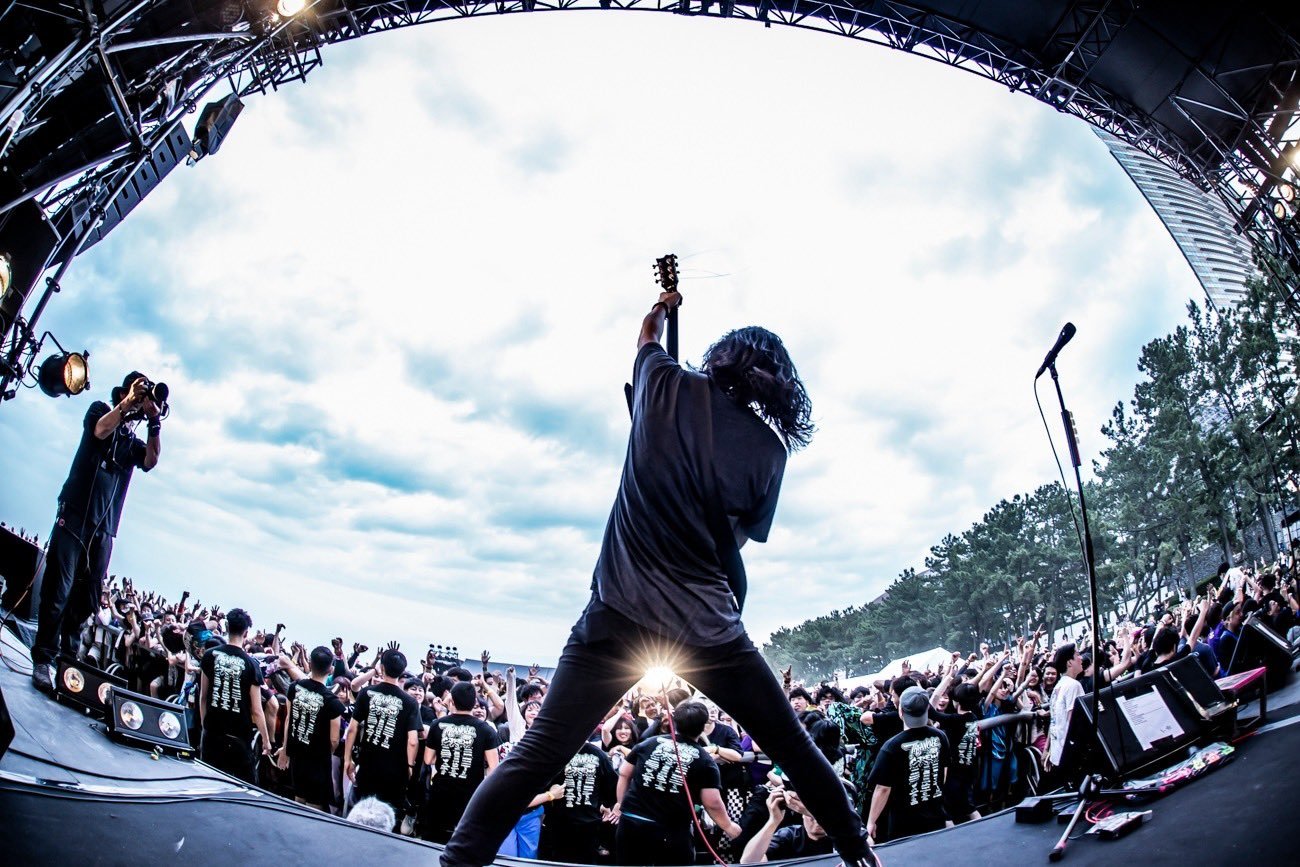 2日目のトリを飾るのは、北九州・小倉発のHERO COMPLEX。地元の雄として、イベントを締める存在として、期待が募るなか「『TRIANGLE』! ヒーローがきたぜ!」と、ドカンとド派手に音を鳴らし「Feel so good」へ。タイトルまんま、最高なコンディション&パワフルなツインボーカルがご機嫌に響く。実は事前に決めていたセットリストを、当日ガラリと変えてきた彼ら。これが大正解! そう思わせるほど「ライブハウス直送」なサウンドが観客の想いを昂らせる。