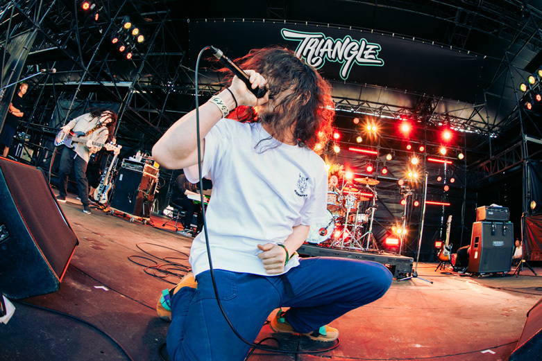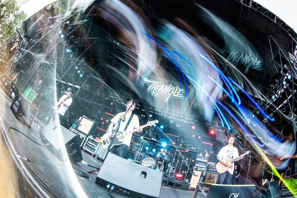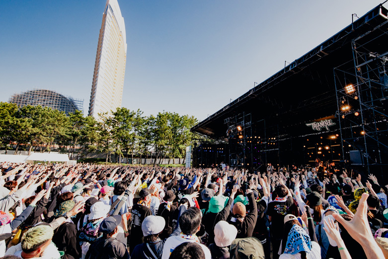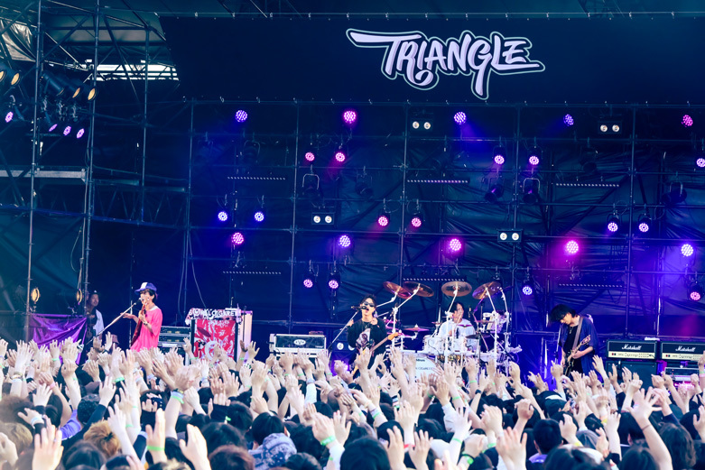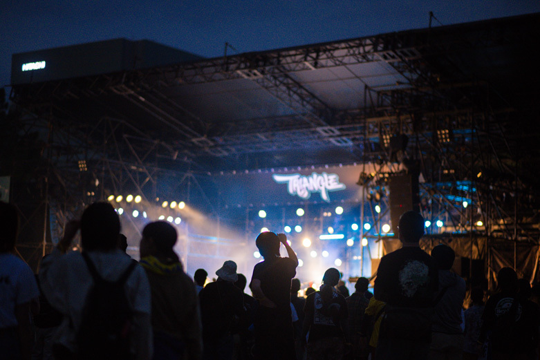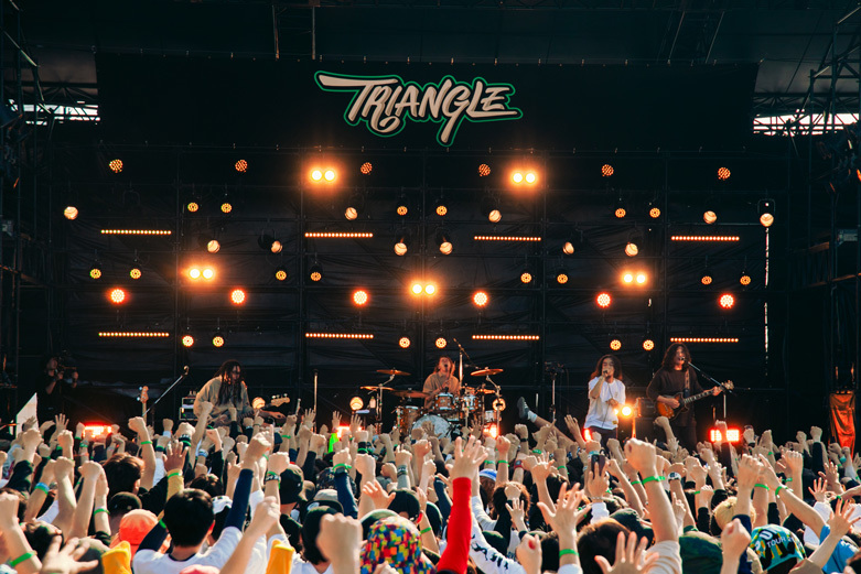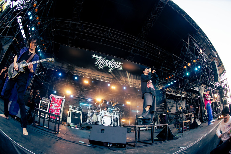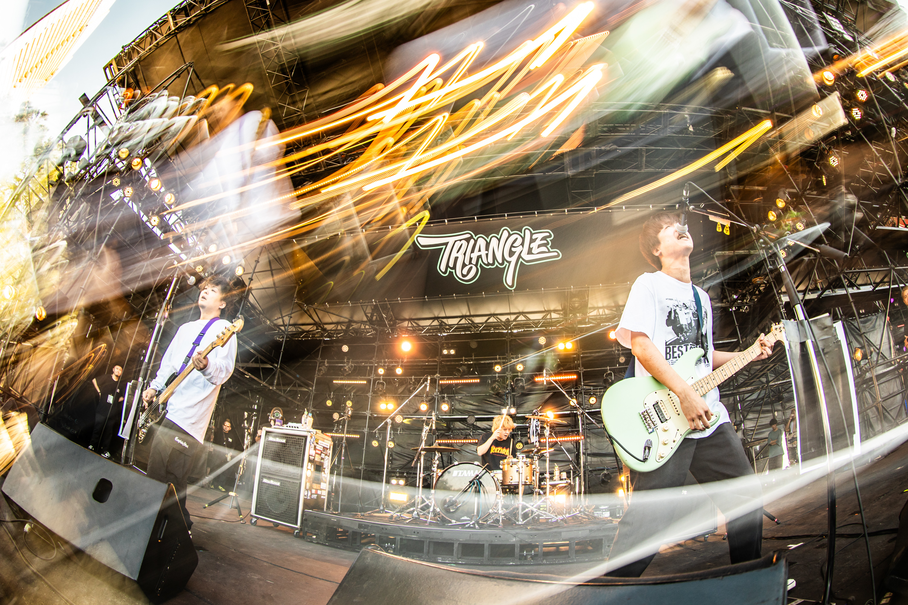 開場時間になると、入り口のアーケードの前で列を成していたオーディエンスが歓喜の表情を浮かべながら続々と入場。お目当てのバンドTを着た人たちだけでなく、過去の『TRIANGLE』のTシャツを着ている人の多さが、いかに開催を心待ちにされていたのかを物語っているようで印象的だった。