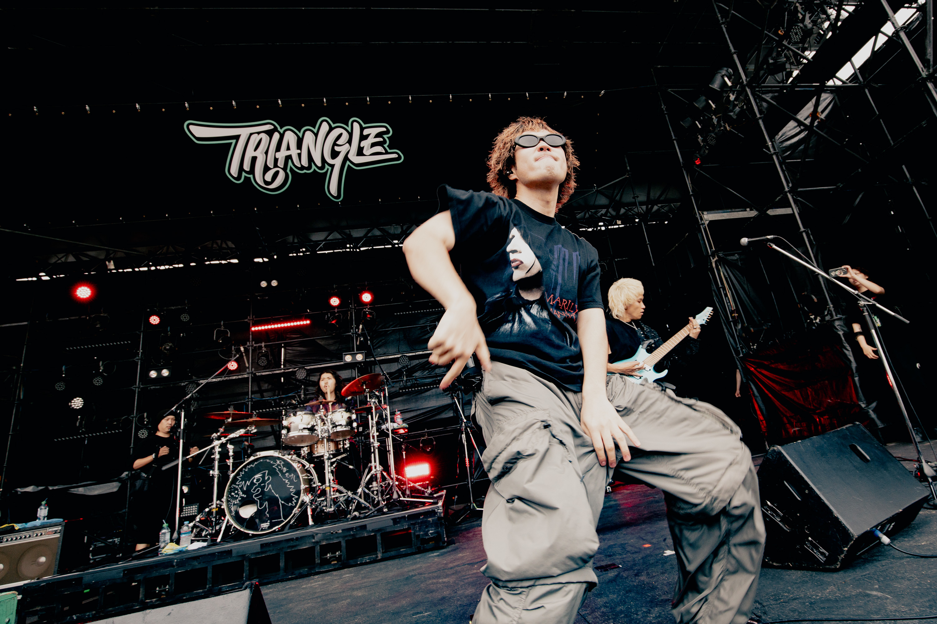 トップバッターは、地元・福岡出身のPaledusk。「Lose Yourself」でアグレッシブにライブをスタート。KAITO(Vo)の合図でフロアはもみくちゃとなり、朝から問答無用にぶち上げていく。「人生で初めてのフェスが『TRIANGLE』で当時は難しい曲ばかりやってたけど、(初めて聴いた人の)入り口になるような曲がないと、と思ったことをキッカケに作った曲です」とKAITOが話し、「Blue Rose」へ。まだ自分たちのことを知らない人にこそしっかりと届けたい、という真摯な姿勢が一気通貫した、誠実さと熱情に溢れたステージで堂々とスタートダッシュをきった。