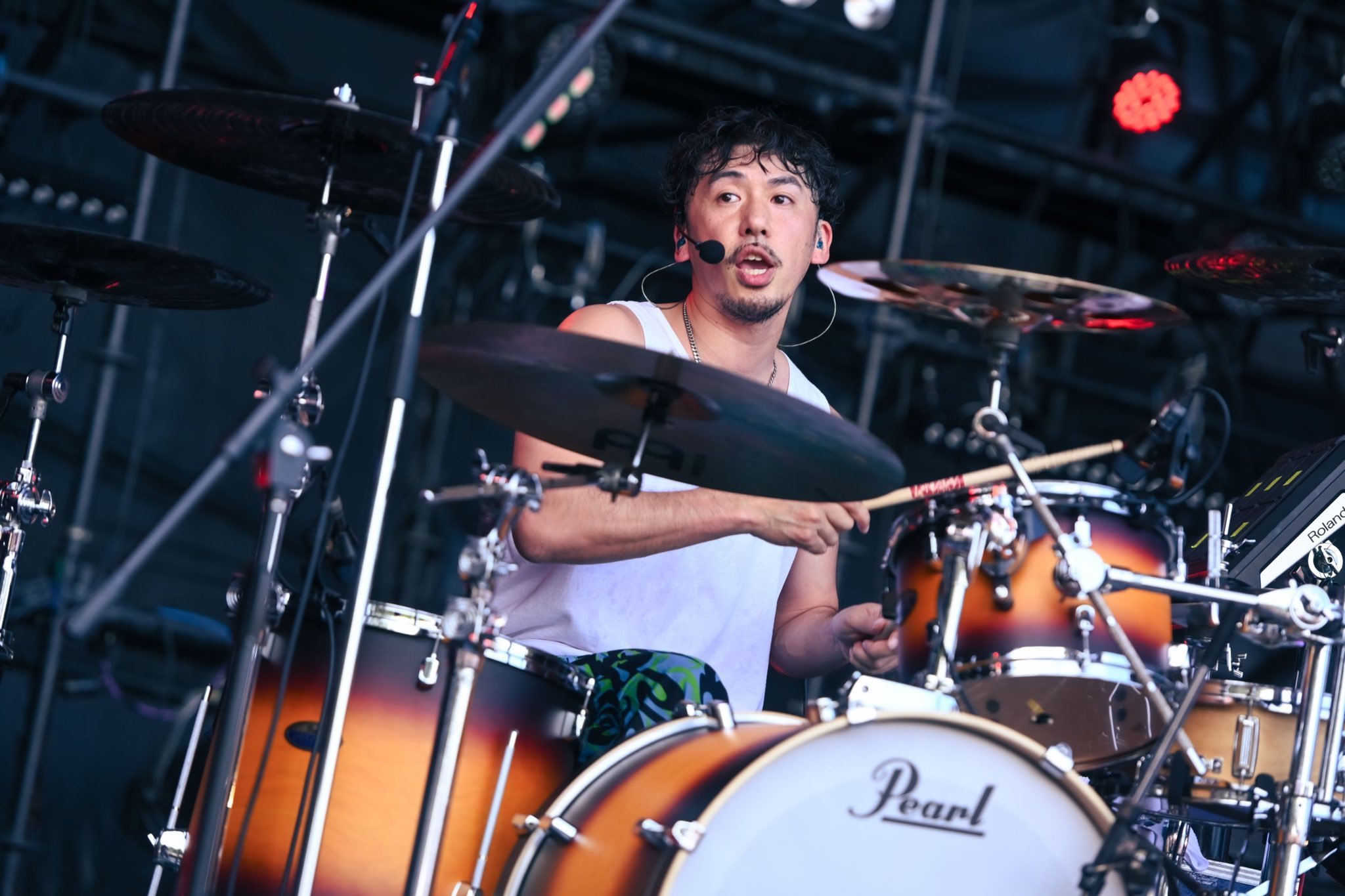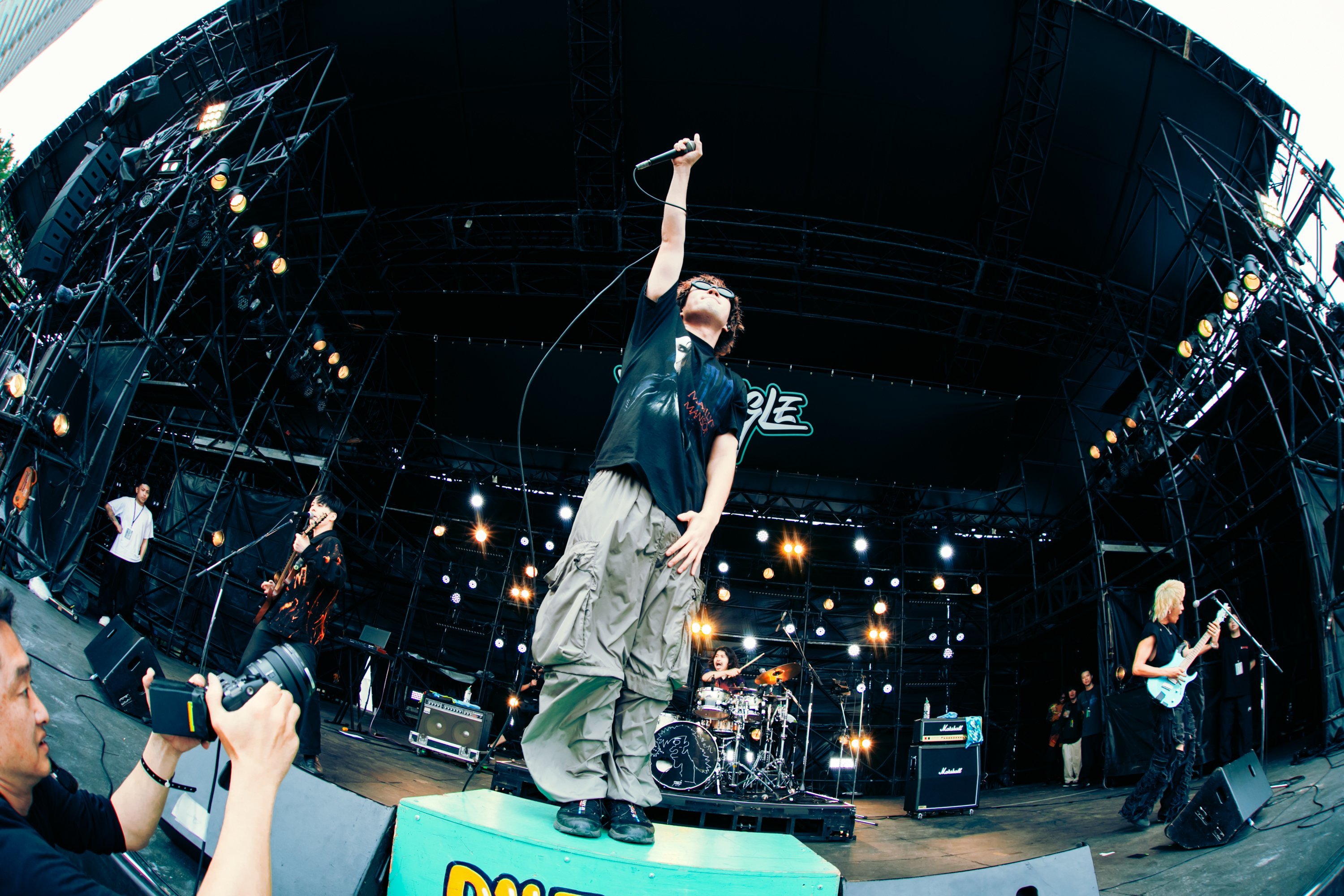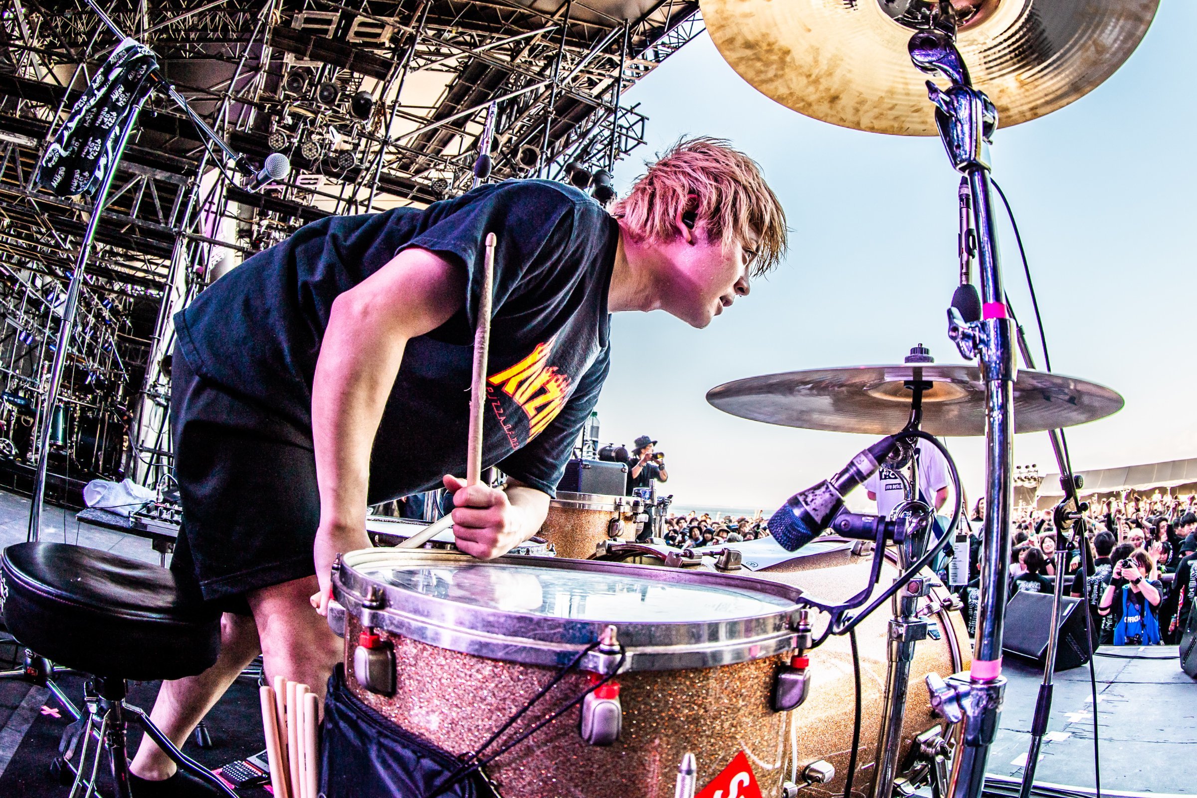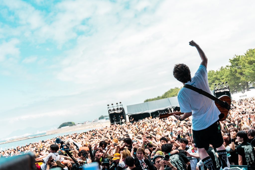 一転して爽やかに、自分たちのスタイルを貫いたのは福岡発の神はサイコロを振らない。柳田周作(Vo)が「結成した頃からずっと出たかったフェス。激しいバンドの中に自分たちがいてもいいのか心細かったけど、考える必要がないくらいみんな盛り上がってくれて」と穏やかな表情をみせた。海沿いのロケーションにぴったりの「キラキラ」で美しい音色を届けたかと思えば、「修羅の巻」でゴリっとロックなスタイルを見せつけるレンジの広さを見せつける。最後まで華やかに、クラップ&ジャンプを誘う堂々たるライブで爪痕を残した。