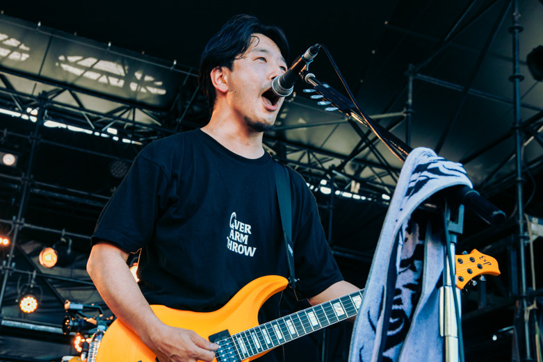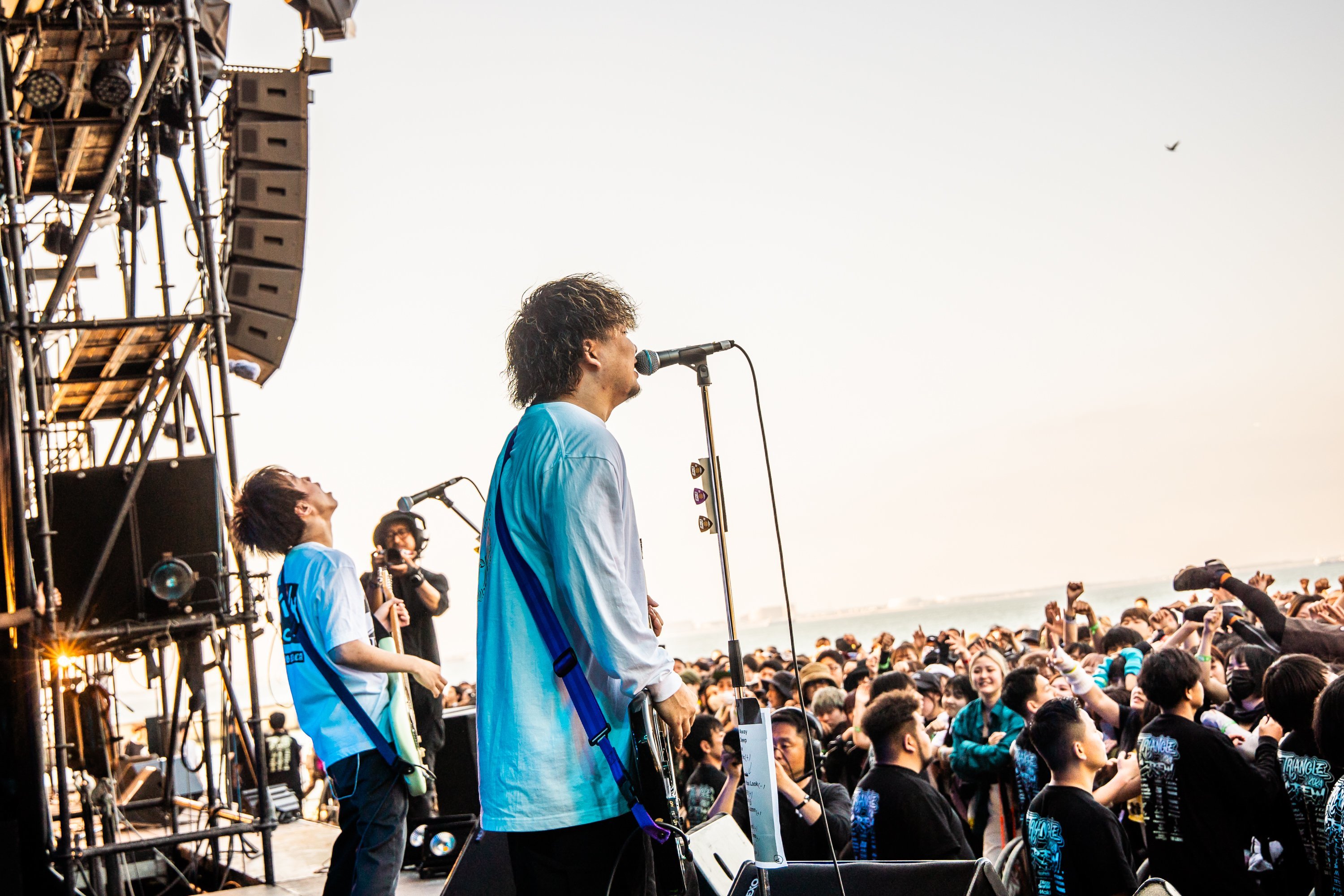 OVER ARM THROWは「Stardust」で火蓋を切って落とすと、「Spiral」「ZINNIA」と問答無用に立て続けに投下。オーディエンスも拳を突き上げ、振り落とされまいと熱をぶつける。気づけばビーチにサークルが現れ、砂埃が舞う。海風と日差しが心地よく感じるほどの熱狂の渦を巻き起こしていく。後半戦につれて勢いは加速するばかりで、「Dear my songs」では菊池信也(Vo.Gt)が膝をついて迫真のプレイ。寺本英司(Dr.Cho)の打ち鳴らすリズムが鼓動を早め、鈴野洋平(Ba.Cho)の拳に合わせて衝動のままに体をぶつけ合う、凄まじい盛り上がりに。