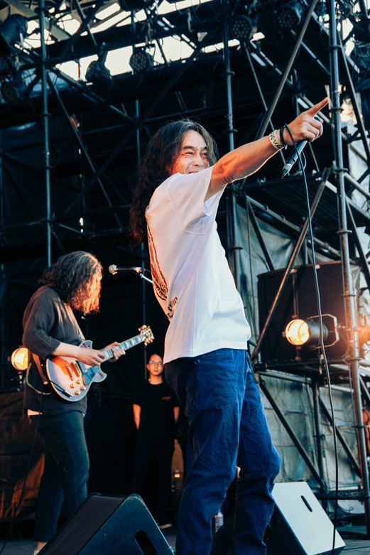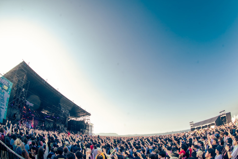 山びこのように海を渡り、対岸の島からも歌がかえってきそうなほど雄大なステージをみせたG-FREAK FACTORY。「海がない群馬県からきました。海が見えるステージは数年に1回だから嬉しい」と茂木洋晃(Vo)。「『TRIANGLE』が数年間諦めなかったから、今日ここに来れた」と開催されたことへの感謝を伝える。晴れたからと「SUNNY ISLAND STORY」を披露し、ラストは九州でのライブの足掛かりを築いてくれた主催・PROJECT FAMIRYに、そして集まったオーディエンスと作り上げる3日間に捧げるようにして届けられた「Fire」が、胸にいつまでも反響している。