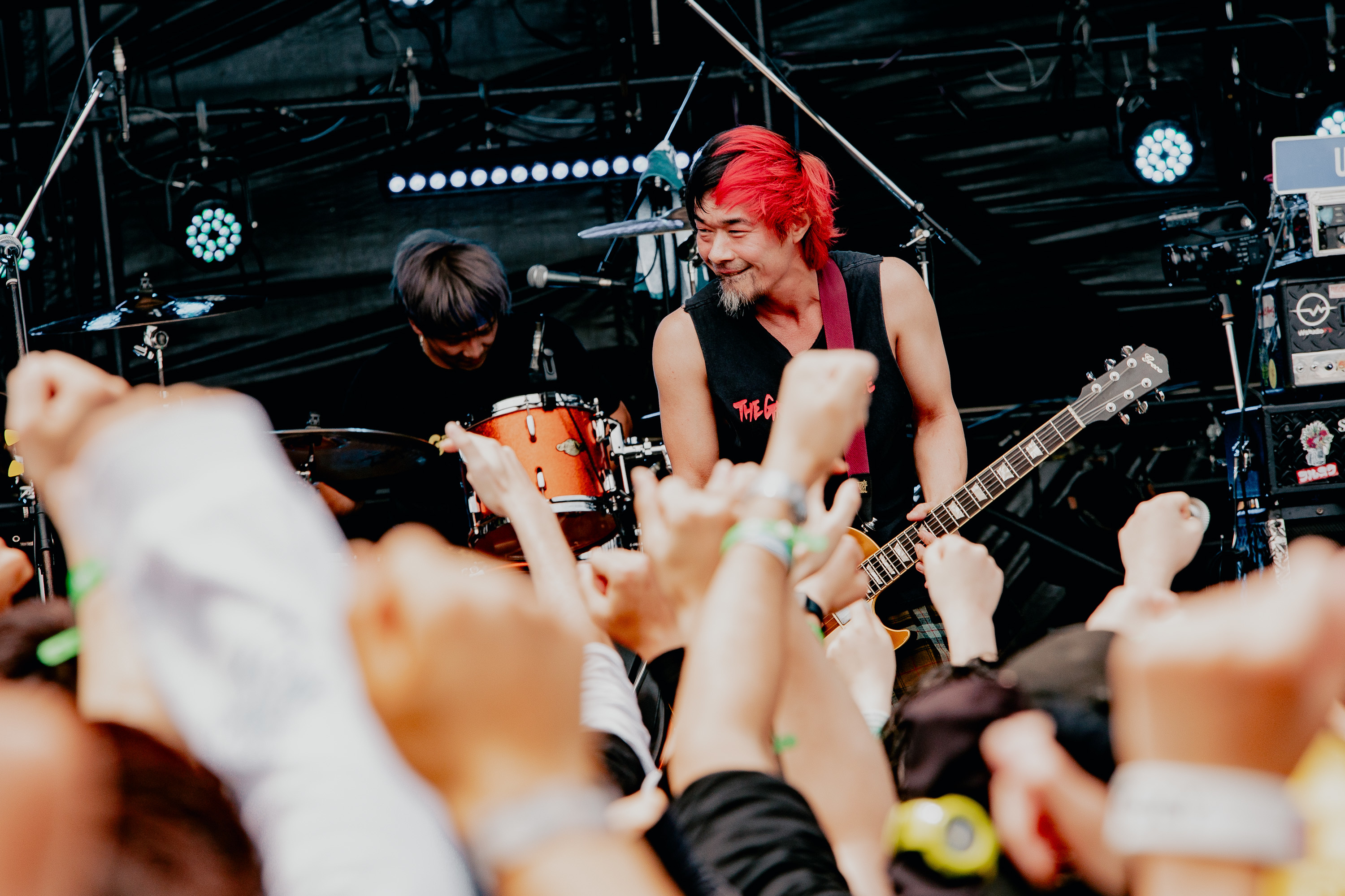 GOOD4NOTHINGは、「Cause You’re Alive」からフルスロットルで「RIGHT NOW」「Maximize」と畳み掛ける。U-tan(Vo.Gt)が「めちゃくちゃ楽しいやんけー!」と見せたはち切れんばかりの笑顔は、オーディエンスの表情の写鏡であり、フロアは早々に沸点めがけて高騰。MCでは「大好きな仲間の大事なイベントに出させてもらえて、バンドマン冥利につきます!」と喜びを露に。今年25周年、4月に新メンバーとしてsasa(Dr.Cho)が加入したばかりのGOOD4NOTHINGにとっても特別なステージであり、その想いの丈は最新アルバム『HEARTS BURNING』の楽曲を織り交ぜながらしっかりと届けられた。