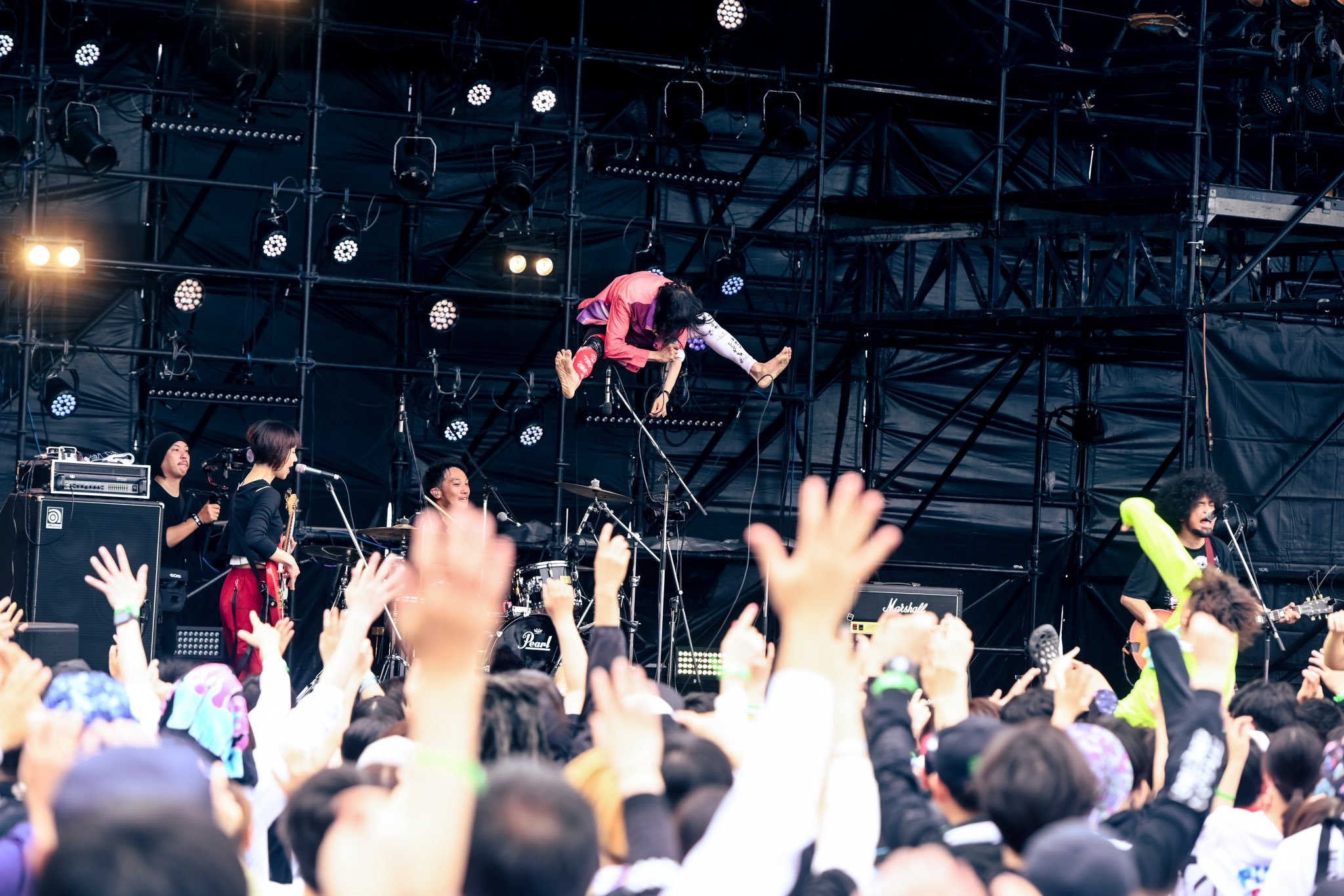 初出場のSPARK!!SOUND!!SHOW!!はというと、「JUNGLE BUN DEM」でライブをスタートさせたかと思うと全員楽器を置いてダンスしたり、隣り合わせのもうひとつのステージまで走り回ったりとルール無用のお祭り騒ぎに。フロアをかき回して踊らせたかと思えば、沁みる「アワーミュージック」を聴かせたりする緩急がにくい。「ヘビーローテーション」ではPaleduskのKAITOが参加してさらに熱気を上昇させ、ラストスパートはビーチの砂埃が舞う大狂乱。チヨ(Ba.Cho)もダイブし、タナカユーキ(Vo.Gt)はオーディエンスの頭上をサーフしたり鉄骨を登ったりと鮮烈なステージングで心を鷲掴みにした。