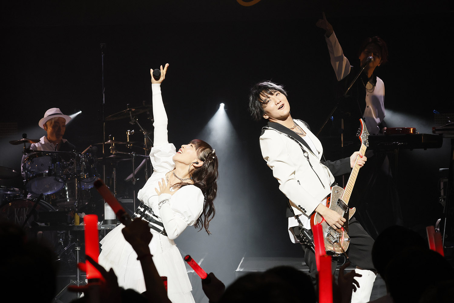 歌い終えたatsukoへのカワイイコールが飛び交う中で始まった二度目のMCタイムでは、angelaも多くの楽曲で関わった『蒼穹のファフナー』シリーズへの思いや、山手線内で今日のライヴに向かっていたファンがおばあちゃんに席を譲っていたのを知り合いから聞いて嬉しかった話、先日行われた「KING SUPERLIVE 2024」にまつわる裏話などで盛り上がる。