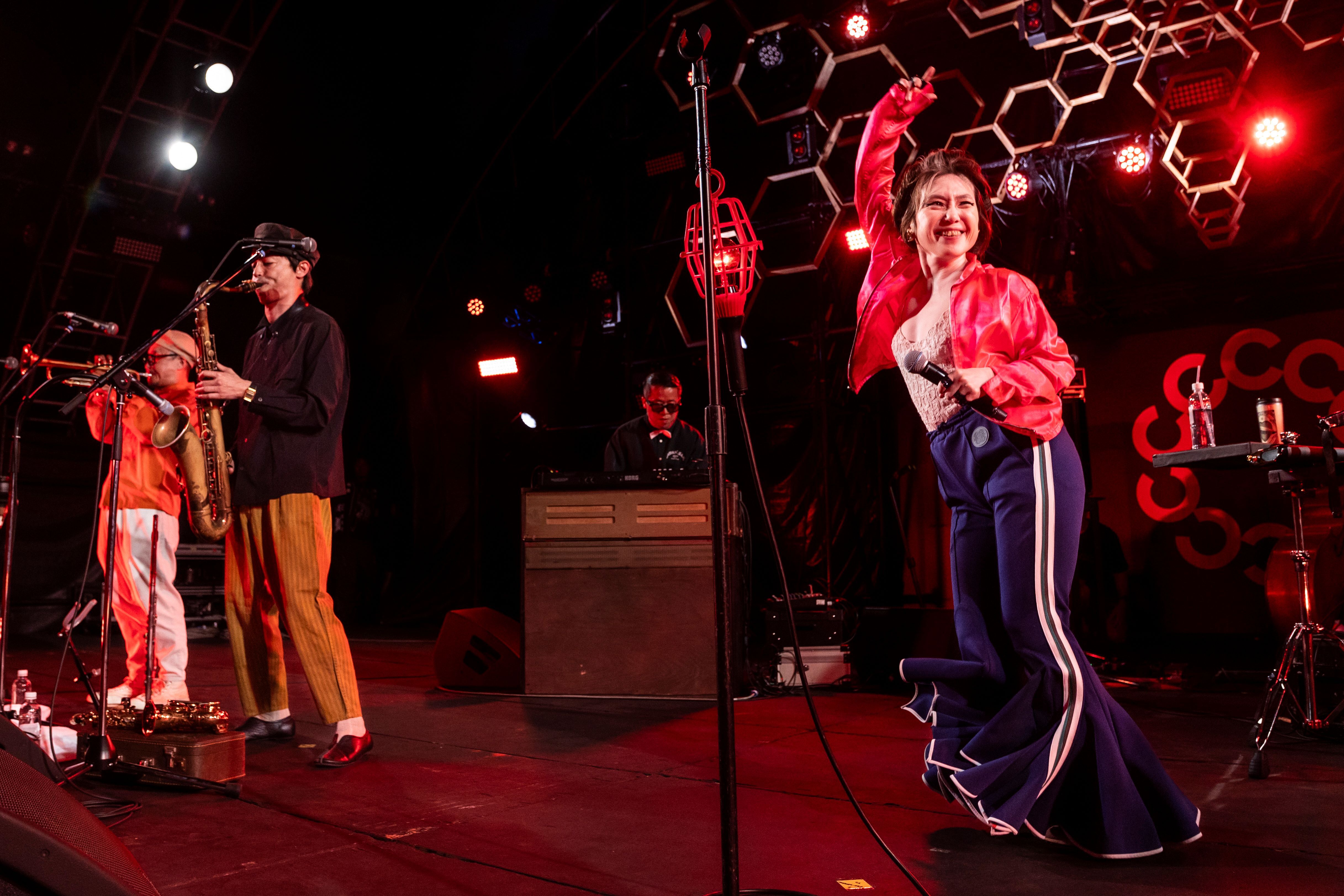 2日間の大トリEGO-WRAPPIN’。CIRCLE STAGE19時10分からだが、18時50分のリハーサル時点で中納良恵もステージに現れて、「マイクチェック! エゴラッピン! リハーサル! ワンツーワンツー!!」と本意気の声でリズムに乗っていく。屋台に並んでいる観客も、それだけで早くも踊っている。翌日は月曜日だというのに、多くの観客が初日同様に観客エリア前方に陣取っている。あれだけ暑かったのに、すっかりライブが始まる頃には涼しくなっており、日中以上に観客もノリノリで1曲目「Neon Sign Stomp」から踊りまくっている。