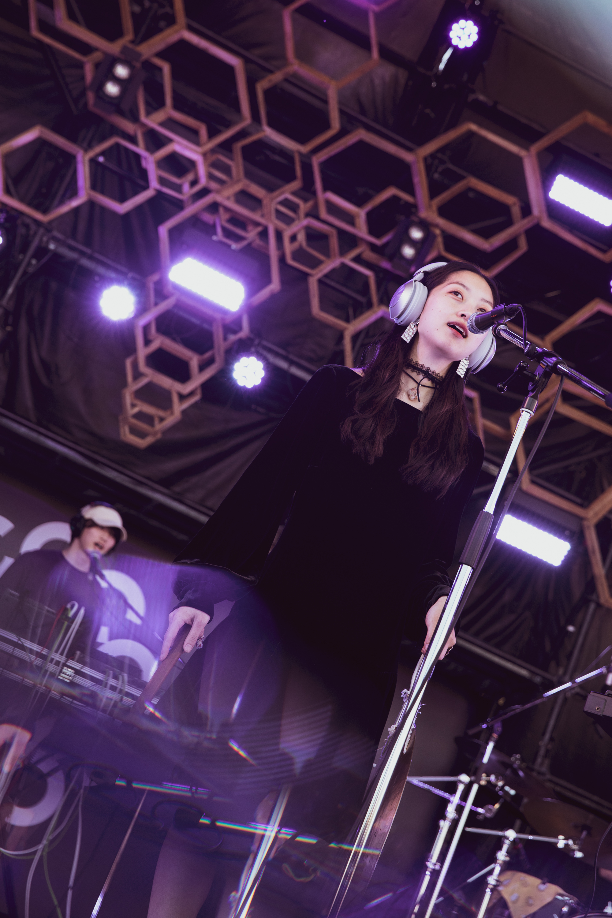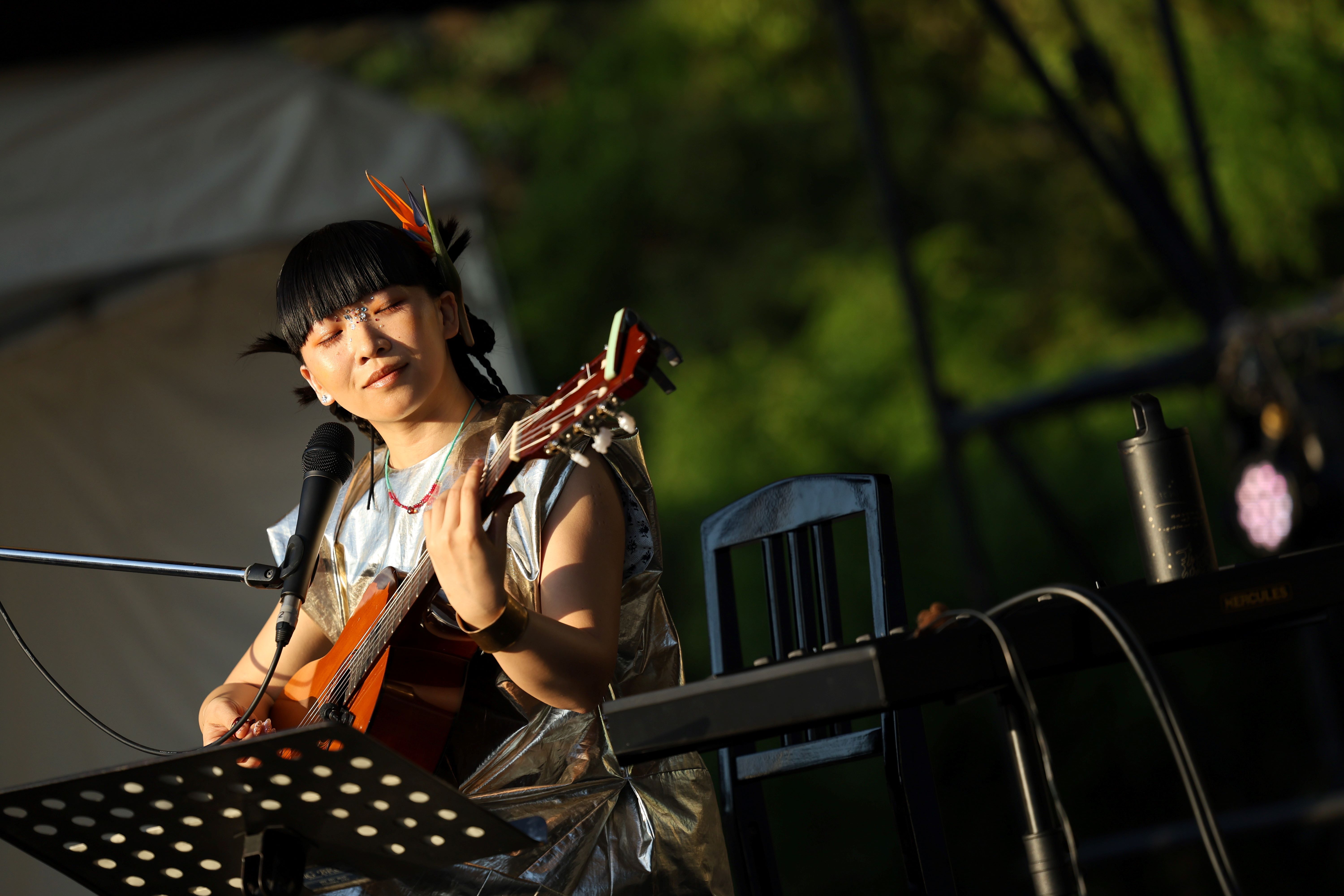 笑いながら本人は言っていたが、2日間の終わりが近づいてきた18時過ぎという時刻だからこそガリが持つ清涼感が重要なのだ。ゆっくり後ろで聴いていても良いと促しながら、ギターを爪弾き「テリフリアメ」で始まる。「今日は新しい曲をたくさんやろうと」と言いながら、新曲を奏でていく。静かな音楽に浸っていると、鳥の鳴き声や屋台売り子の声も混ざってくる。でも、それが決して違和感が無く、それも含めて彼女の音楽に聴こえてくるのは摩訶不思議だ……。まだ日が暮れず、空に薄く白い月が見える中での「月の丘」は、どこか幻想的でもあり、フィナーレに向けて心身が浄化された時間だった。
