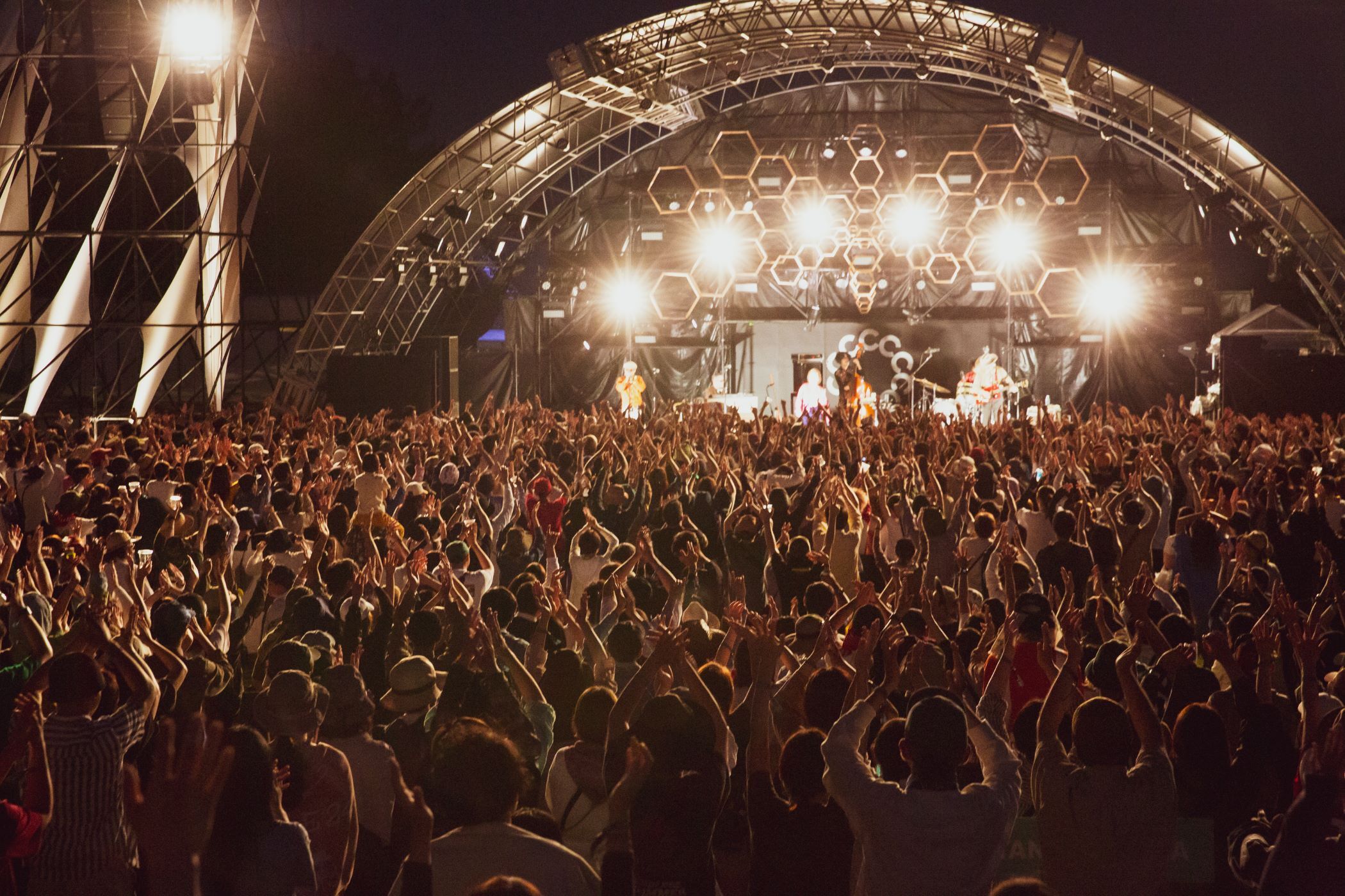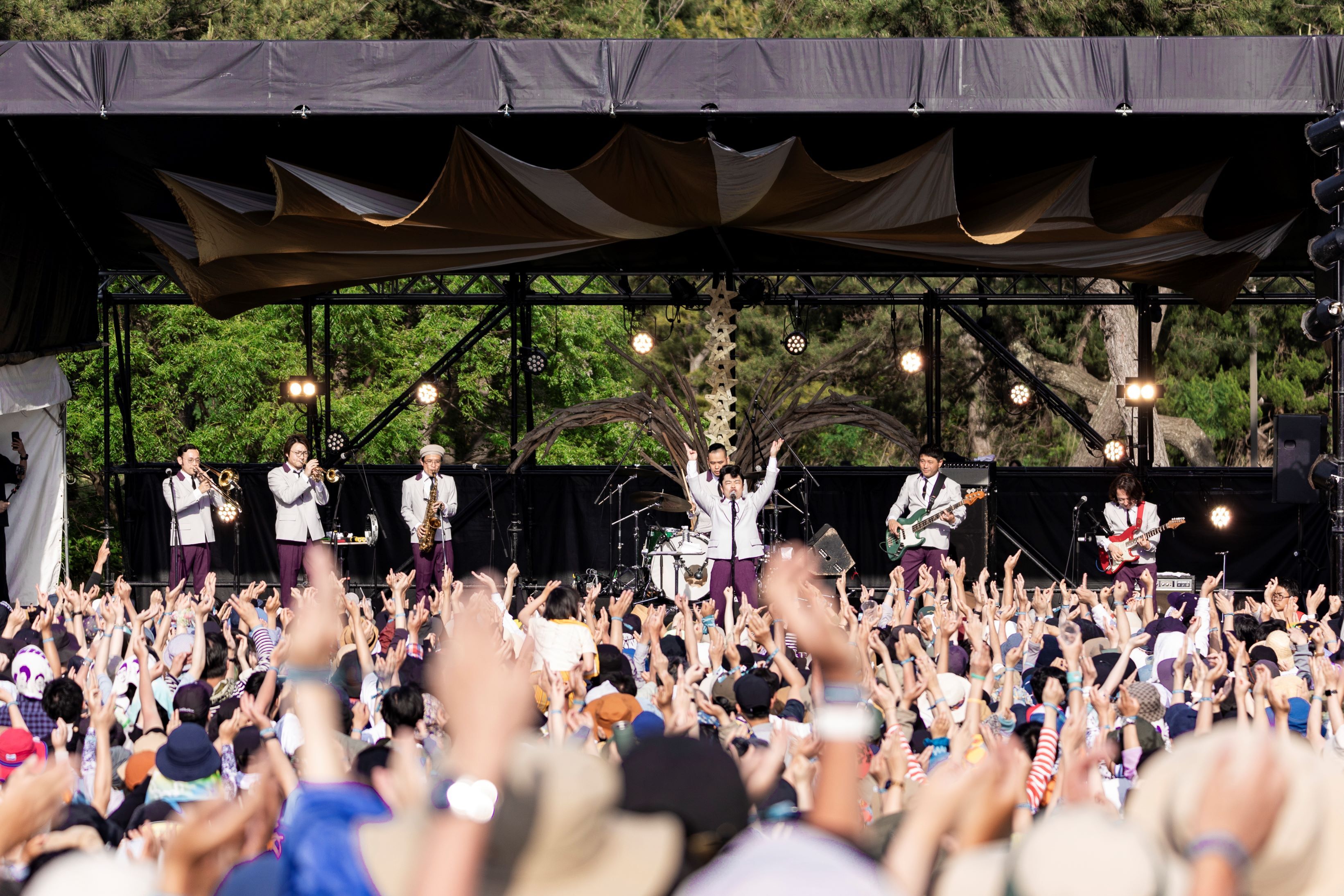 「空とぶ東京」はポップでキャッチ―なナンバーであり、そのスペイシーなサウンドは野外にピッタリで、朝イチにも関わらず多くの人がゆらゆらふわふわ踊っている。「花様年華」のDaidoとMaoの掛け合いの歌声にスティールパンの音色も乗っかったりと全ての歌と音に耳を傾けてしまう。いわゆるチルアウト的な感じだけでは無く、終盤にかけて徐々に熱を帯びていき。「アートマン」から「tradition」では、太古の昔の儀式はこうだったのではないかと思えるくらいに踊る事に没頭してしまう……。ラストナンバー「琉球Boogie Woogie」では三線も鳴らされ、「イヤーサーサー!」という合いの手にもたまらなく高揚する。世代で言えば、去年のムーンライダーズ、今年の大貫妙子らといったレジェンド世代の孫世代だが、世代関係なく良き音楽が鳴らされるのが『CIRCLE』であり、良き音楽の遺伝子継承を確かめられるのも『CIRCLE』なのだなと感激してしまった……。