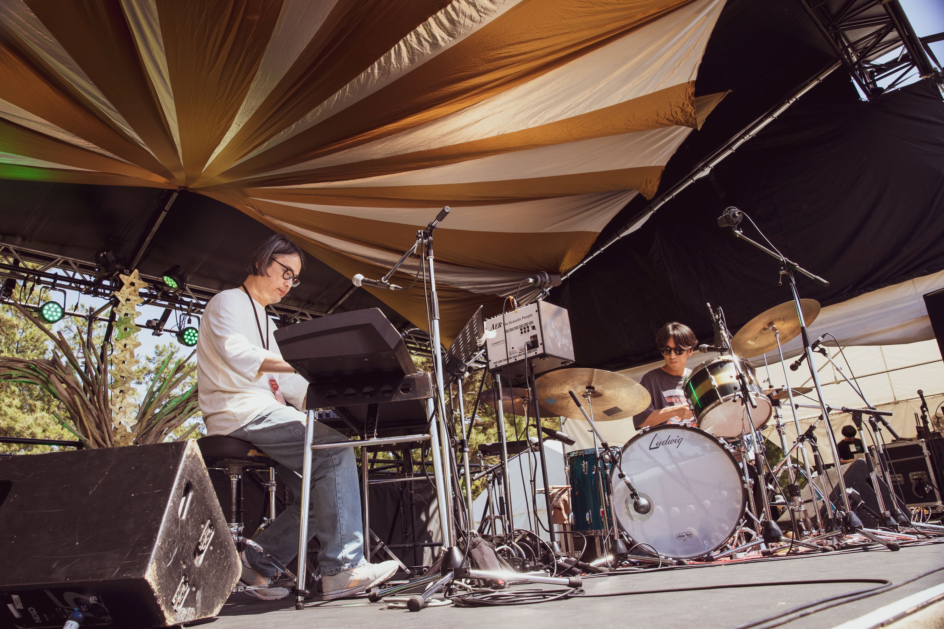 KOAGARI STAGE二番手グッドラックヘイワ。野村卓史(key)と伊藤大地(Dr、口笛)によるインストゥメンタルデュオだが、少し斜め気味に横一列に並び、ふたりが顔を見合わせながら演奏する。ふたりきりでインストなのに、いやふたりきりのインストだからこそなのか、もっぱら聴き入るのみであり、音の楽しみを追求しまくっていたら完成したみたいな究極に研ぎ澄まされて削ぎ落された音楽であった。野村が福岡でしか髪を切らないので数年ぶりに散髪したという謎エピソードも面白かったが、そこへの伊藤の「『CIRCLE』にちょこちょこ出ないとね!」という返しも絶妙。ふたりという人数だけで考えると少人数でありながら、この存在感と感嘆せざるをえなかった……。