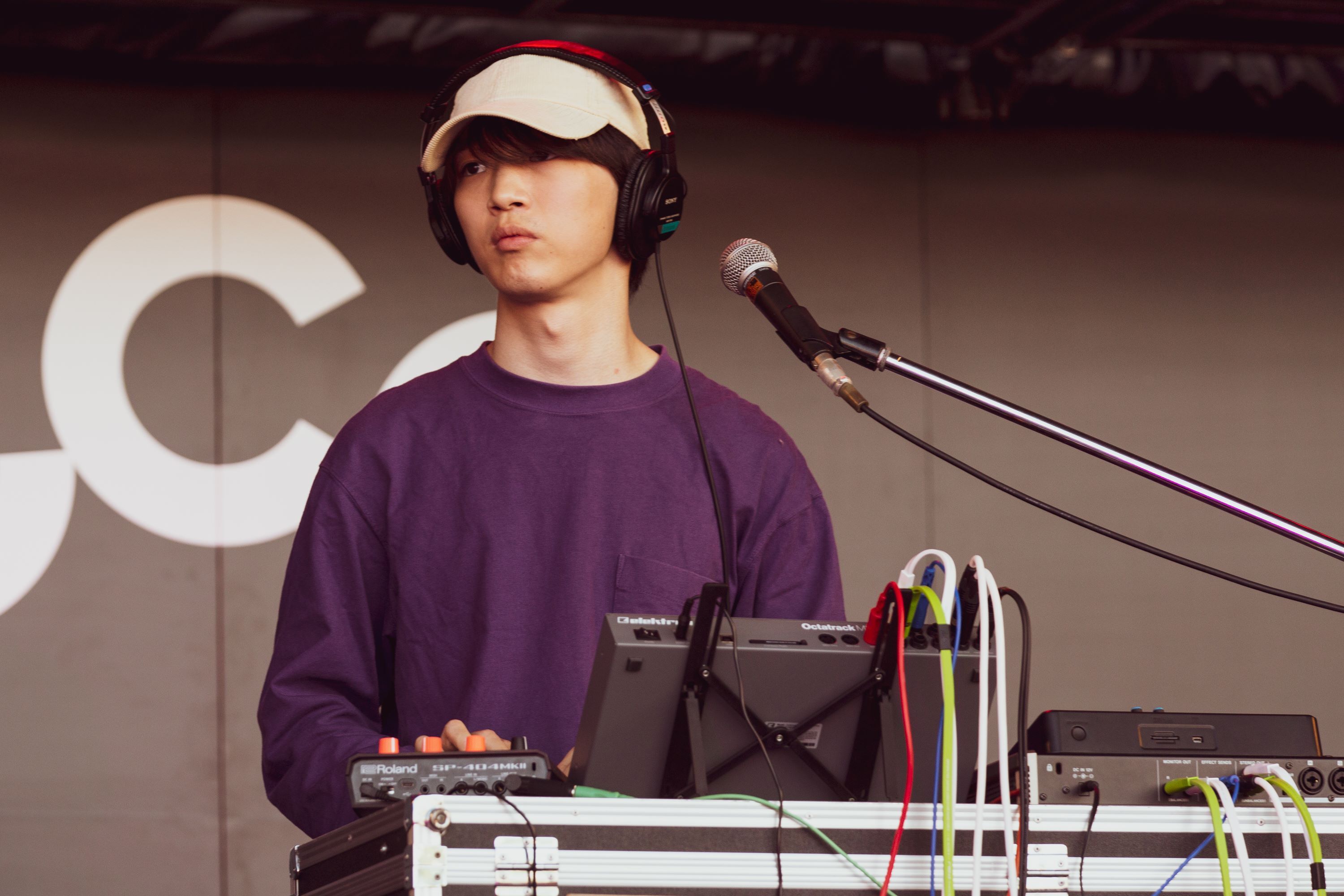 CIRCLE STAGEトップバッター11時半にはCHO CO PA CO CHO CO QUIN QUINが登場。2日続けて初出演のトップバッターだが、CHO CO PA COは音楽好きの間で昨年くらいから話題になっており、まだライブ本数も数えるほどなので、この日の私含め観客の期待度はとても高かった。小学校からの幼馴染であるDaido(作曲、映像)、So(サウンドエンジニア、DJ)、Yuta(Ba)、そしてサポートメンバーのドラムとパーカッションの5人で現れる。電子音楽と民族音楽の融合というと陳腐な言い方になるが、初めて聴いた時に若い世代が鳴らす新しい音楽と素直に感じた。ライブで初めて聴いたが、ライブの本数が多くないとはいえ、その姿は威風堂々としていて、何はともあれ魅入ってしまう。インストナンバー「秩父」を鳴らし終えると、コーラスのMaoも現れて、「ガンダーラ」、「声を聞かせて」、「りんご追分」のカバーとDaidoを中心に歌う。全員がヘッドホンを装着していたりと、何気ない見た目ではあるのだが、若くして独特の雰囲気を持つ集団である。