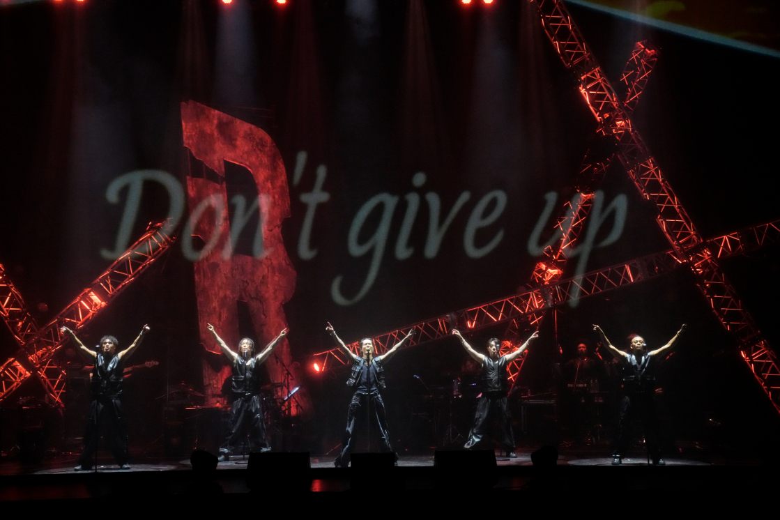 アンコールでは1曲目に「Don’t Give Up」を披露。紗幕に大地や滝といった映像、歌詞を映し出し、今市は幕の後ろで歌を届ける。迫力のある映像、美しいコーラスワークも相まって、壮大さを感じるパフォーマンスだった。
