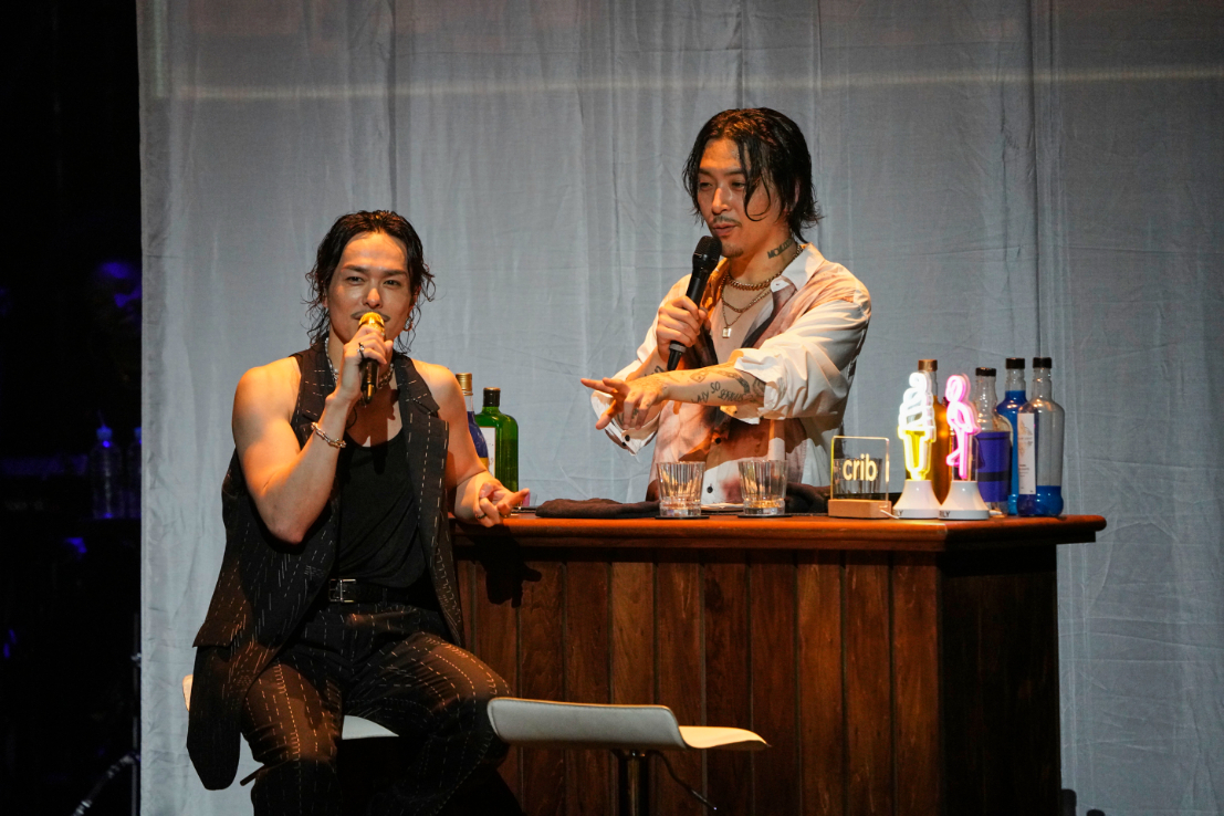 カウンター席に腰かけた今市は、マスター役を務めるダンサーのTAiCHiと、ツアーを振り返って和やかなトークを展開。そのまま、入場時に集めたファンからの質問に答えるコーナーが始まった。「ファイナルだからこそ言える裏話は?」という質問に「熊本公演での『ROMEO + JULIET』のパフォーマンス中にマイクスタンドを倒してしまった」と他公演のエピソードを語ったり、「『LOST“R”』でコール&レスポンスをしたい」というファンの要望に応えたりこのファンとの距離感の近さも、『RILY’S NIGHT』ならではだろう。