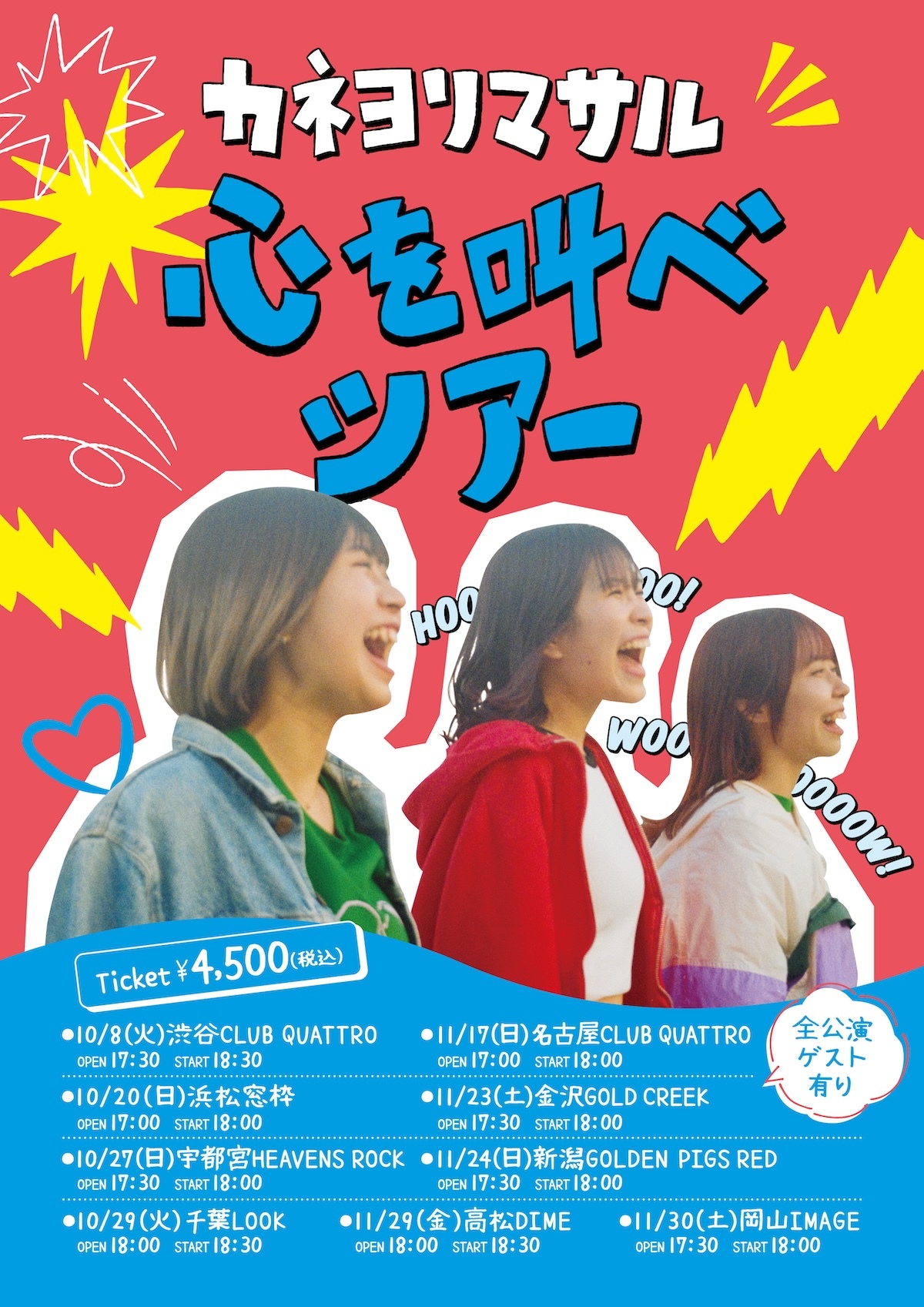 また、10月から11月にかけて対バンツアー『心を叫べツアー』の開催も決定。このツアーで彼女たちは10月8日の東京・渋谷 CLUB QUATTROを皮切りに、11月30日の岡山・岡山IMAGEまで全9公演を行う。オフィシャルファンクラブ「カネヨリマサルの青春倶楽部」では、6月10日23:59までチケットの先行予約を受け付けている。各公演のゲストは後日発表されるとのこと。