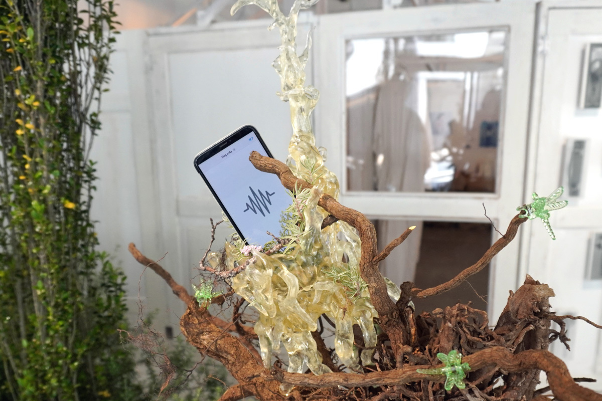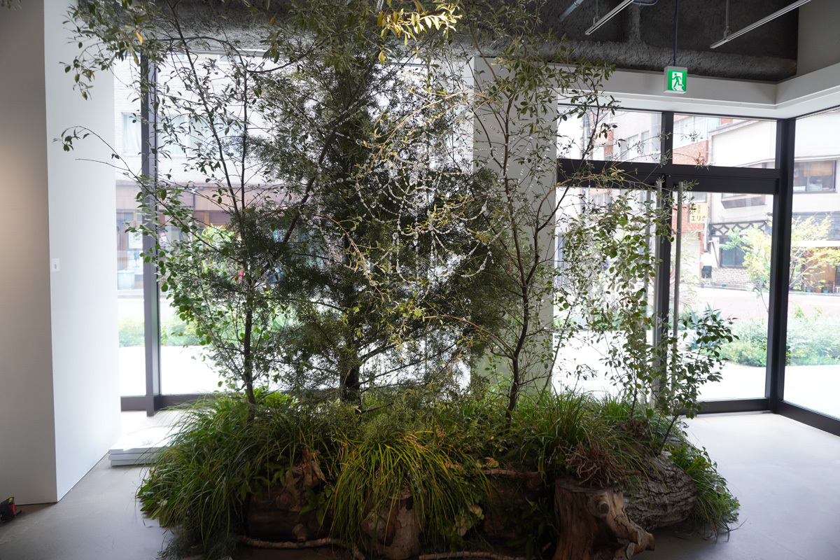 庭を彩る植物を手掛けたのは、いけばな草月流師範のアレキサンダー・ジュリアン。切り株や植物に絡まるスマートフォンの装飾(楽曲「Hug.m4a」より)や、植物の上でヴェールのように輝く蜘蛛の巣(楽曲「人魚」より)をつくったのは、「ファッション」をバックグラウンドに活躍するアーティスト、Christopher Lodenだ。