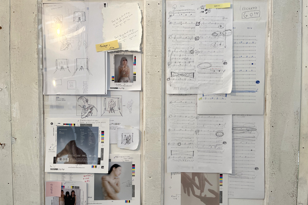 本展のキュレーションを行ったのは、昨年12月にリリースされたアルバム『12 hugs (like butterflies)』のアートワークを担当したクリエイティブディレクターのharu.(HUG)だ。長年に渡り羊文学のアートワークを支え続けてきたharu.は、塩塚モエカのセルフライナーノーツを辿りながら楽曲を再解釈し、アルバムの世界観を体現したという。