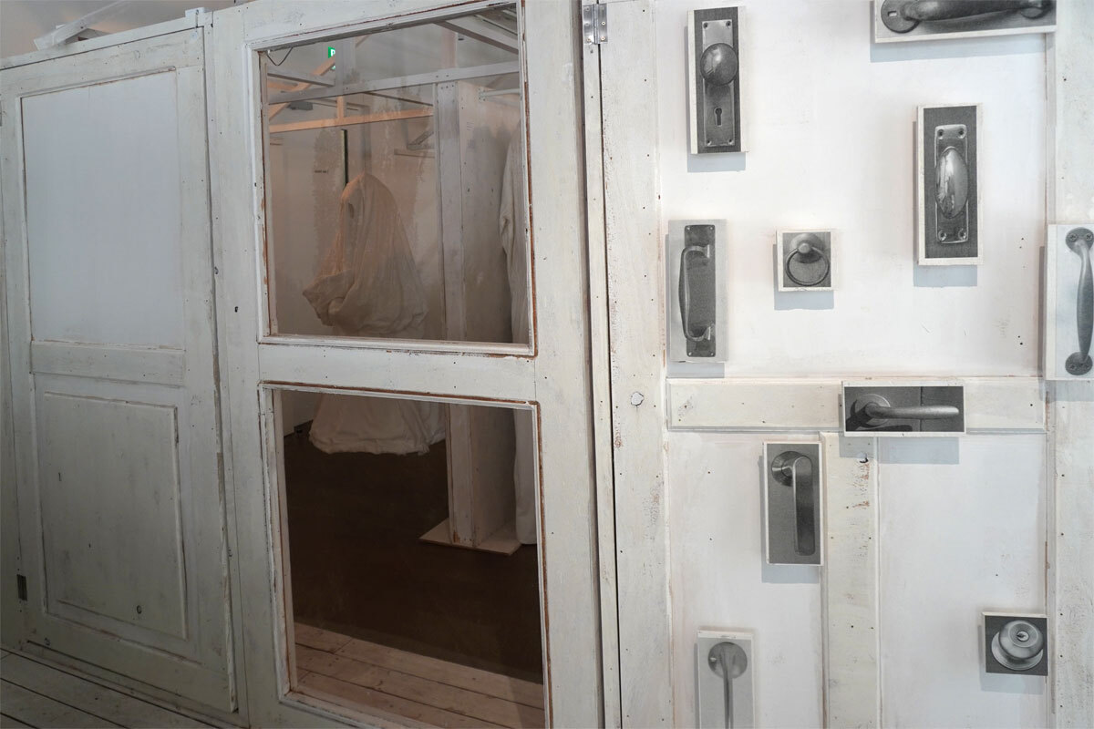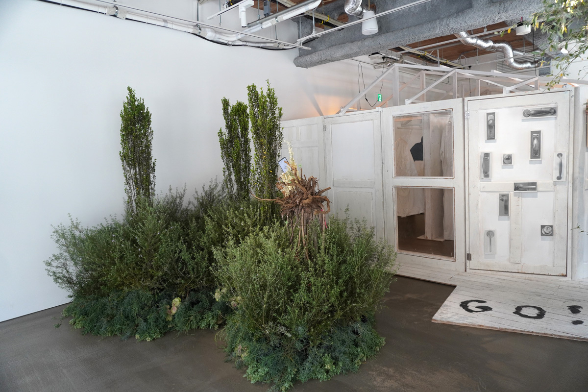 会場には緑豊かな庭が広がり、小屋の扉には、さまざまな取っ手が描かれている。こちらは楽曲「GO!!!」にインスパイアされた作品で、まるで取っ手によって異なる未来を選べるようだ。