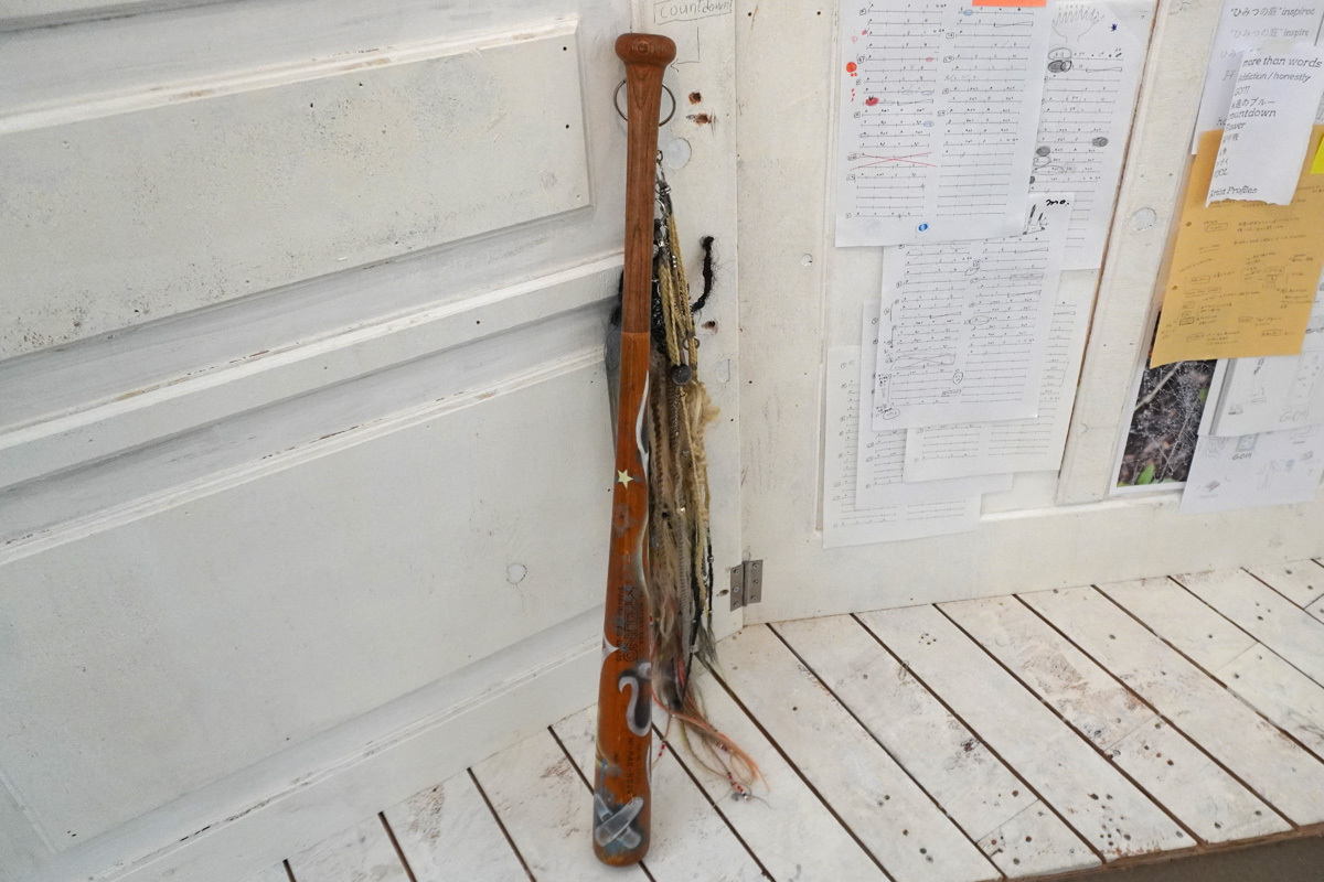 羊文学の楽曲は、幻想的な雰囲気を纏いながら、歌詞は身近な悩みや日常の輝きを語っていて、共感と親密さが漂う。小屋の中には、鏡やシーツのような布(実はおばけを表現している)、バットやジャンプスーツなど、生活風景に溶け込む作品が置かれているので、羊文学の透明感溢れる世界が、観客の日常と地続きであることを示すようだった。