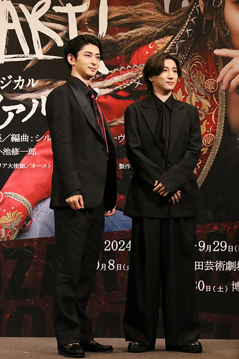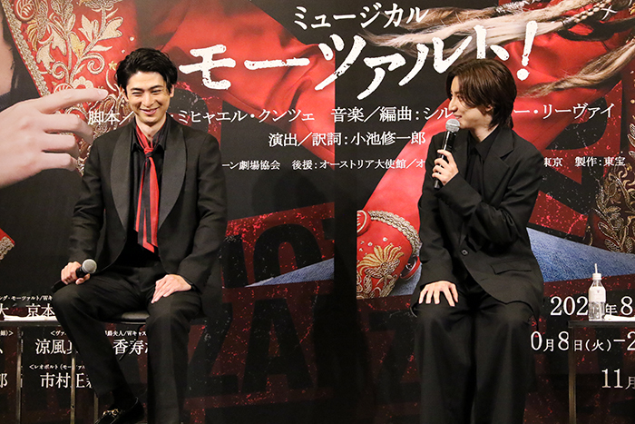 京本:今までの経験も大事にしつつ、新鮮にいろいろなことを取り込んでいく勇気を大切にしてヴォルフガングという役を演じたいです。育三郎さんも難しいといっていたくらい役。雄大くんが自分を追い込むと言っていましたが、僕は自分を追い殺すつもりで。壊れる寸前くらいまで自分を痛めつけながらやらないと皆さんに感動していただけないと思う。共演者・スタッフの皆さんに支えてもらいながらも、自分の足でしっかり立って演じたいと思います。