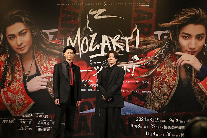 古川雄大・京本大我による製作発表会見では、古川と京本によって新ビジュアルが公開され、古川は「すごい迫力ですよね。これだけヴォルフガングが全面に出ているビジュアルは未だかつてなかったんじゃないでしょうか。圧倒されますし、素敵なビジュアルで公演が楽しみです」と感嘆の声を上げる。京本は「ずっと憧れていた作品で、まさか自分ができるとは思っていませんでした。改めて見ると感動しますね。雄大くんとご一緒できるのも感慨深くて嬉しいです」と語った。