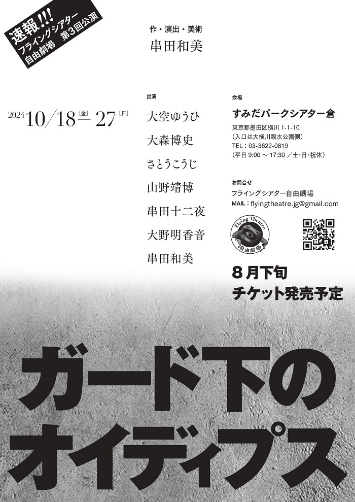 数々のヒット作を生み出し、日本の演劇界を牽引してきた串田和美が、自身が探し求める演劇活動「自由劇場」を再開するため始動した「フライングシアター自由劇場」。第二作目、『あの夏至の晩 生き残りのホモサピエンスは終わらない夢を見た』を6月6日(木)より新宿村 LIVEで上演するが、その開演に先駆けて、第三作目『ガード下のオイディプス』を行うことを発表。