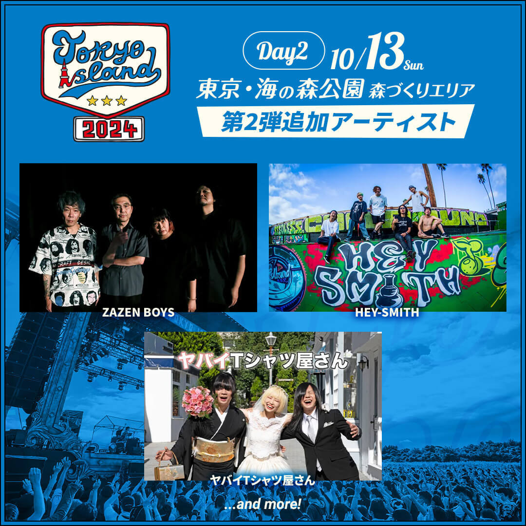 東京・お台場地区の東京湾に浮かぶ新たな埋立島「海の森公園 森づくりエリア」にて開催する音楽フェスティバル『TOKYO ISLAND』(トーキョー・アイランド)が、出演アーティスト第2弾を出演日とともに発表した。