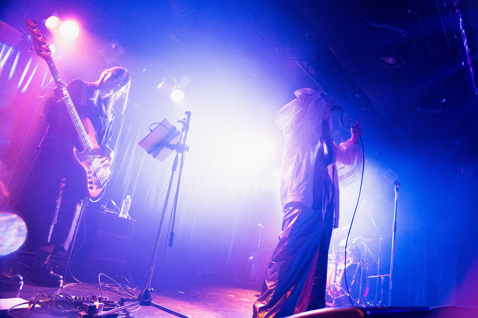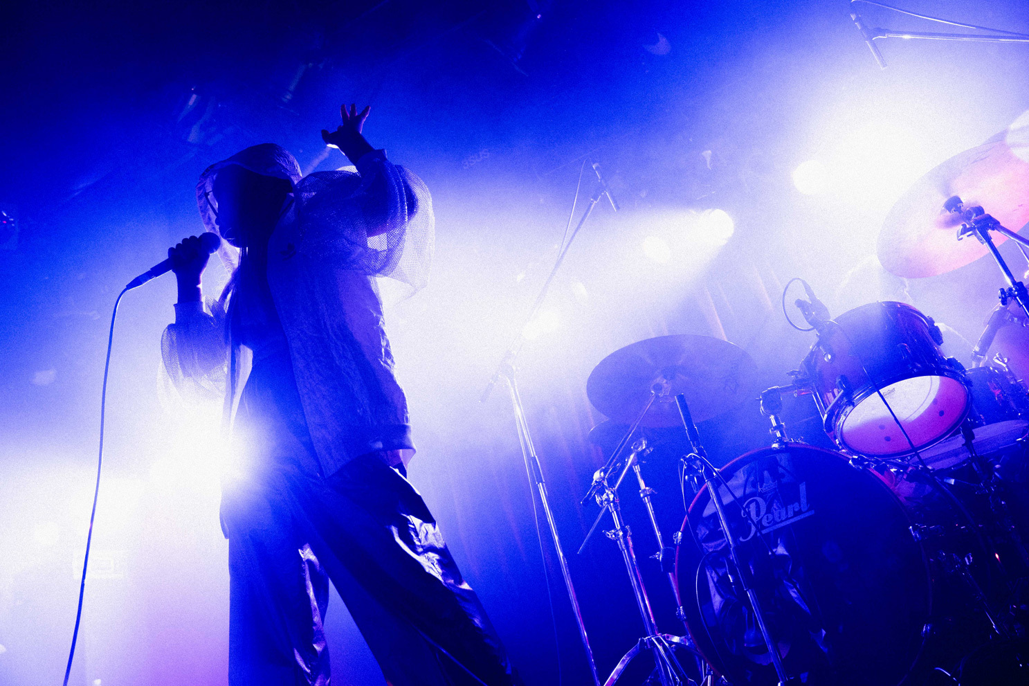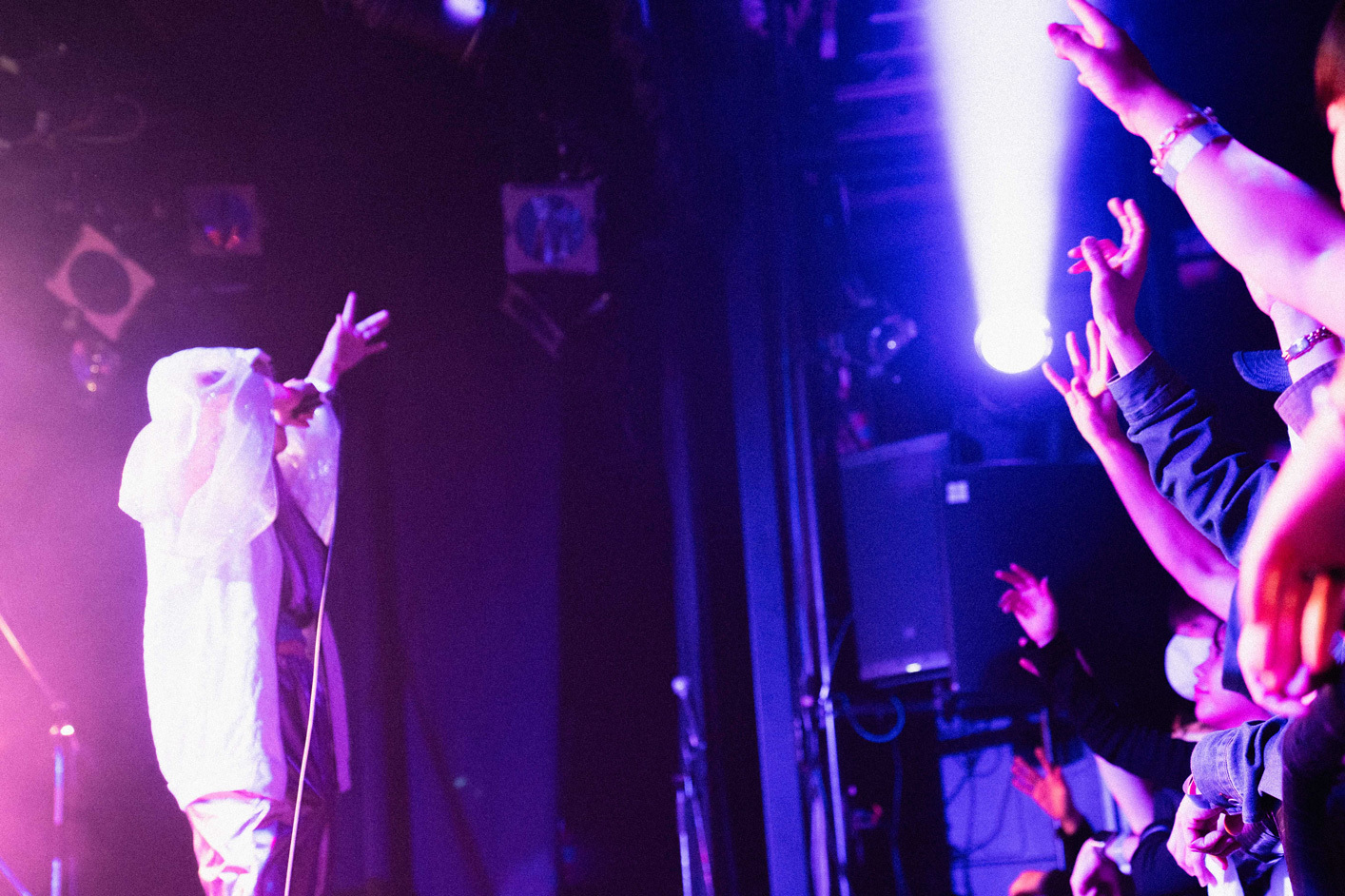 コーラスパートの同期でぐんと世界観を広げ、歌声はより迫力を増す。さらに切ないメロディラインとダイナミズムが美しく共存した「Soap Flower」、ストリングスも入った揺れるように柔らかな「夢遊病」、クールなナンバー「青と棘」を経て、「ここからが紫 今のライブの本番です! ついてこれますか!」と叫んで惹きつけ、「フラットライン」を投下。フロアはハンズアップ&ジャンプで盛り上がる。ラストはSNSでバイラルヒットした「凡人様」を力強く歌い上げ、すさまじいハイトーンのフェイクをお見舞いして30分のライブを終えた。中毒性の強い、さすがのステージングだった。