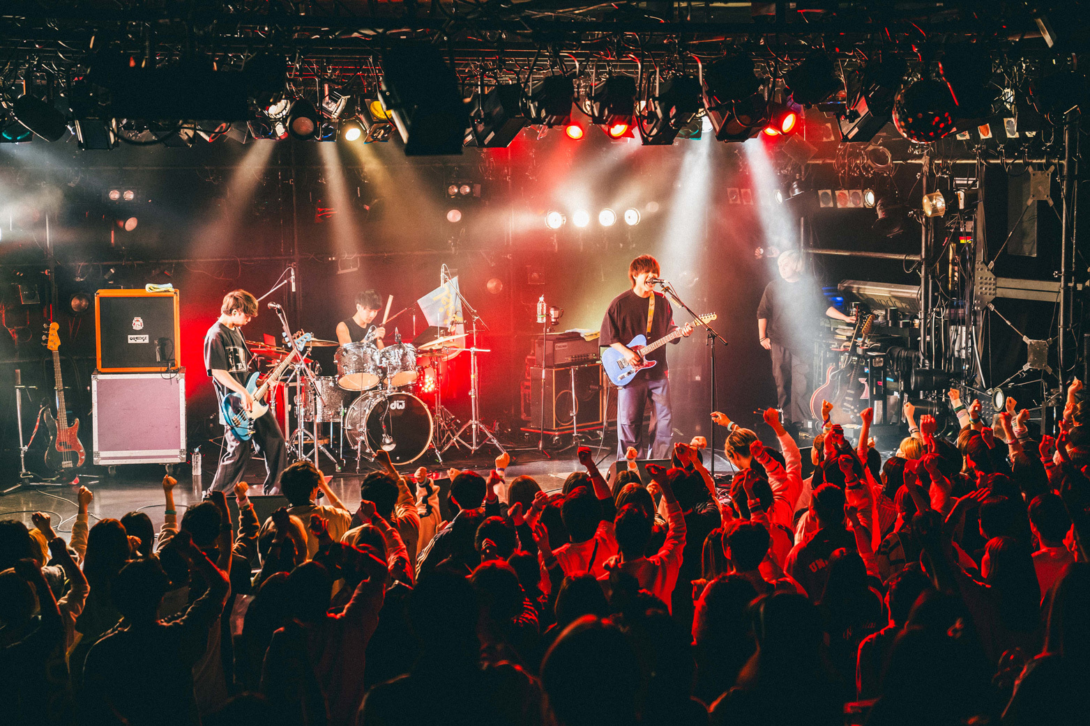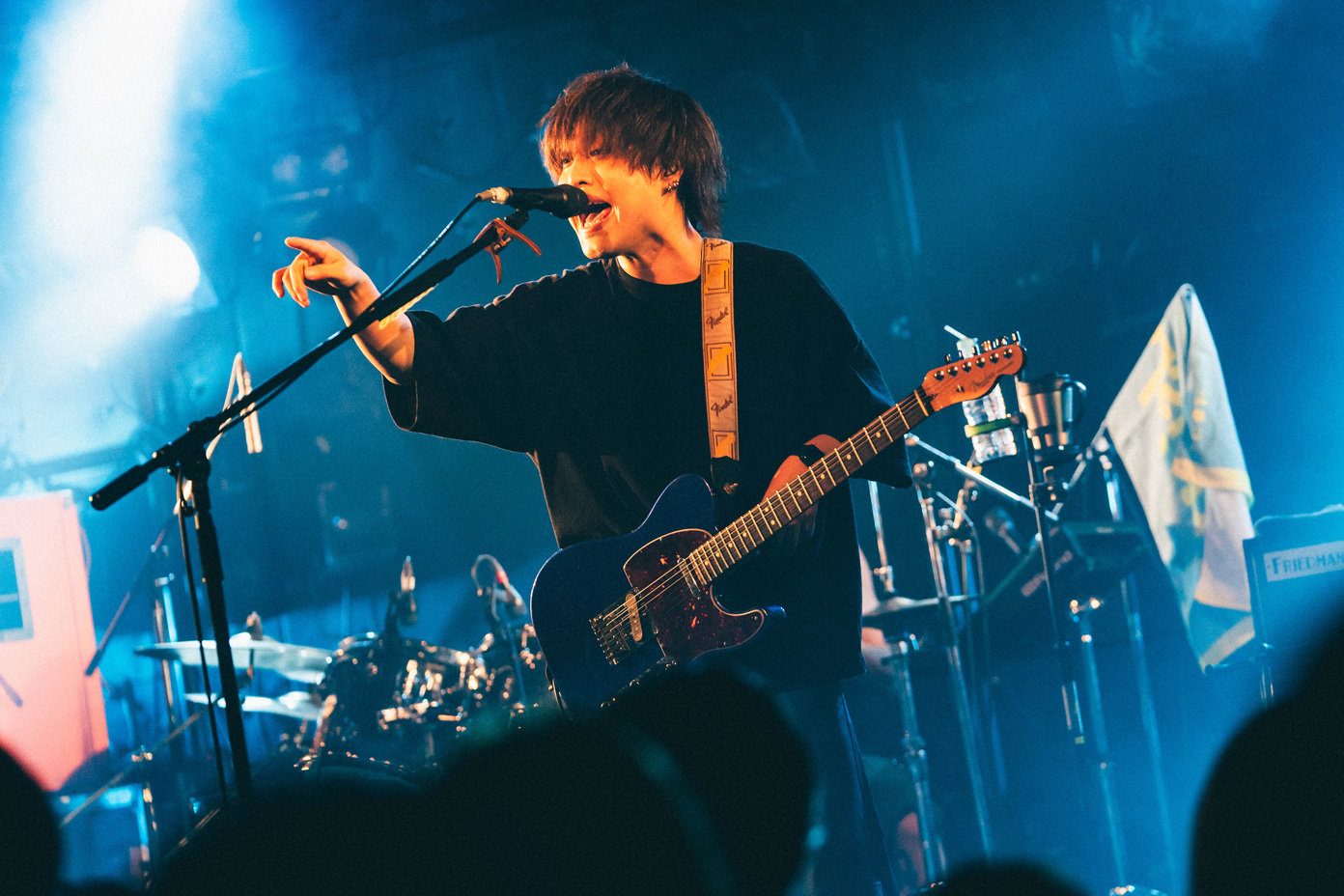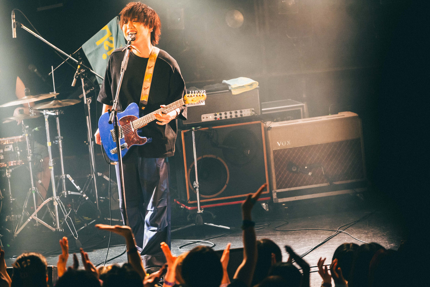 Umeda Zeelaには、2024年1月に活動を開始したばかりのMatty(Vo)、双子のKen_M(Gt)とLyo(Dr) によるノスタルジックモダンロックバンド・LET ME KNOWが、サポートベースに太田あさひを迎えた4人編成で登場。パンパンになったフロアからは、彼らの注目度の高さがうかがえる。SEが流れ、静かにステージの幕が開く。メンバーはグラサンに革ジャンというロックな出で立ちだが、1曲目の「1800」で聴こえてきたギターリフはあまりにキャッチーで、Mattyの歌声は中性的なハスキーボイス。どこか湿度のある日本語ロックは聴けば聴くほど肌馴染みが良く、懐かしさと新しさが同時にやってくる不思議な感覚に陥った。続く「Goodbye Daily」でも、グッドメロディーとジュブナイル感を孕んだ歌詞が、爽やかに駆け抜ける。「バンドマンの元カレ」や「好きなんです」は等身大の若者の恋愛の心情を歌ったJ-POP。Mattyの歌声とそれを支えるバンドサウンドのバランスが絶妙でクセになる。