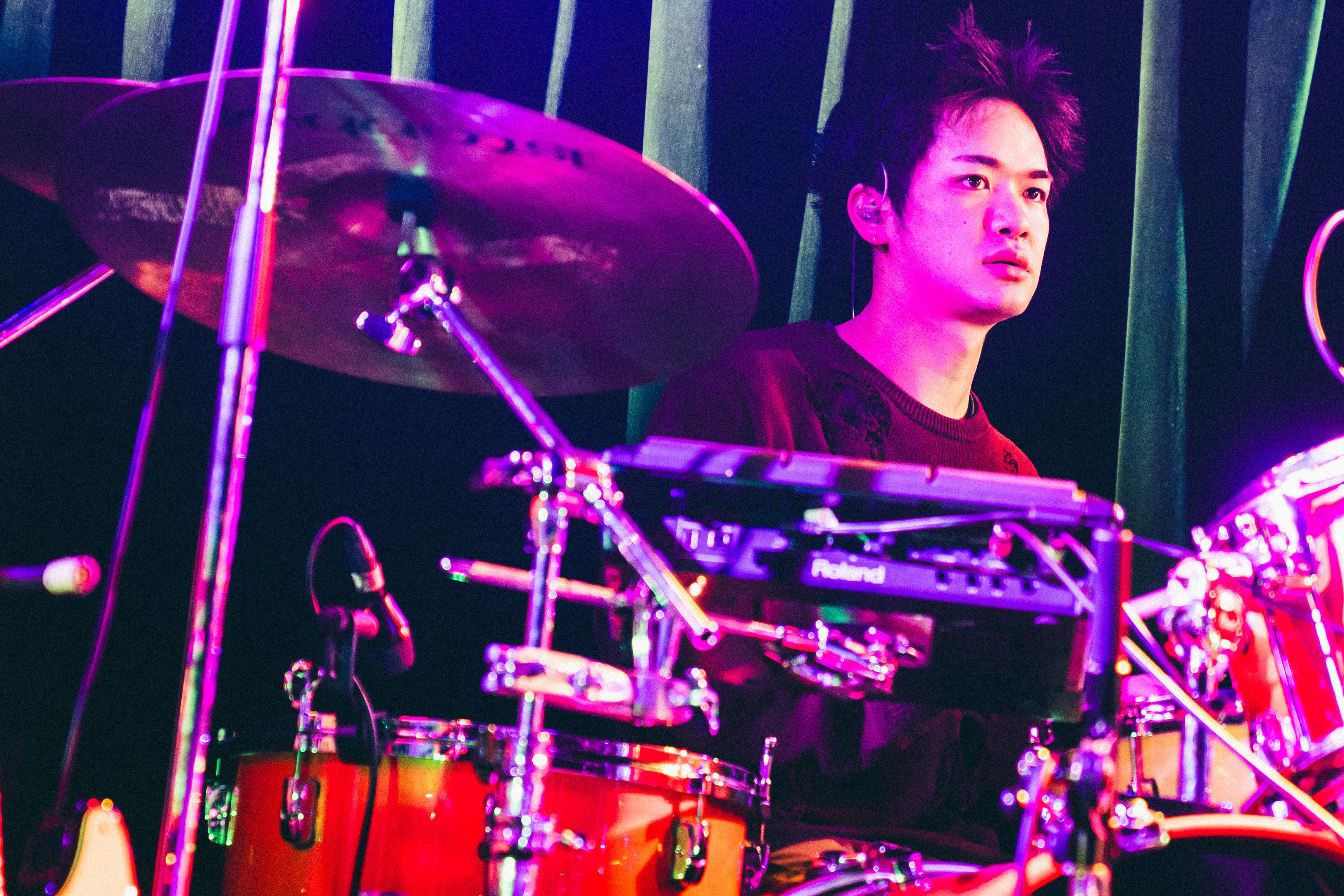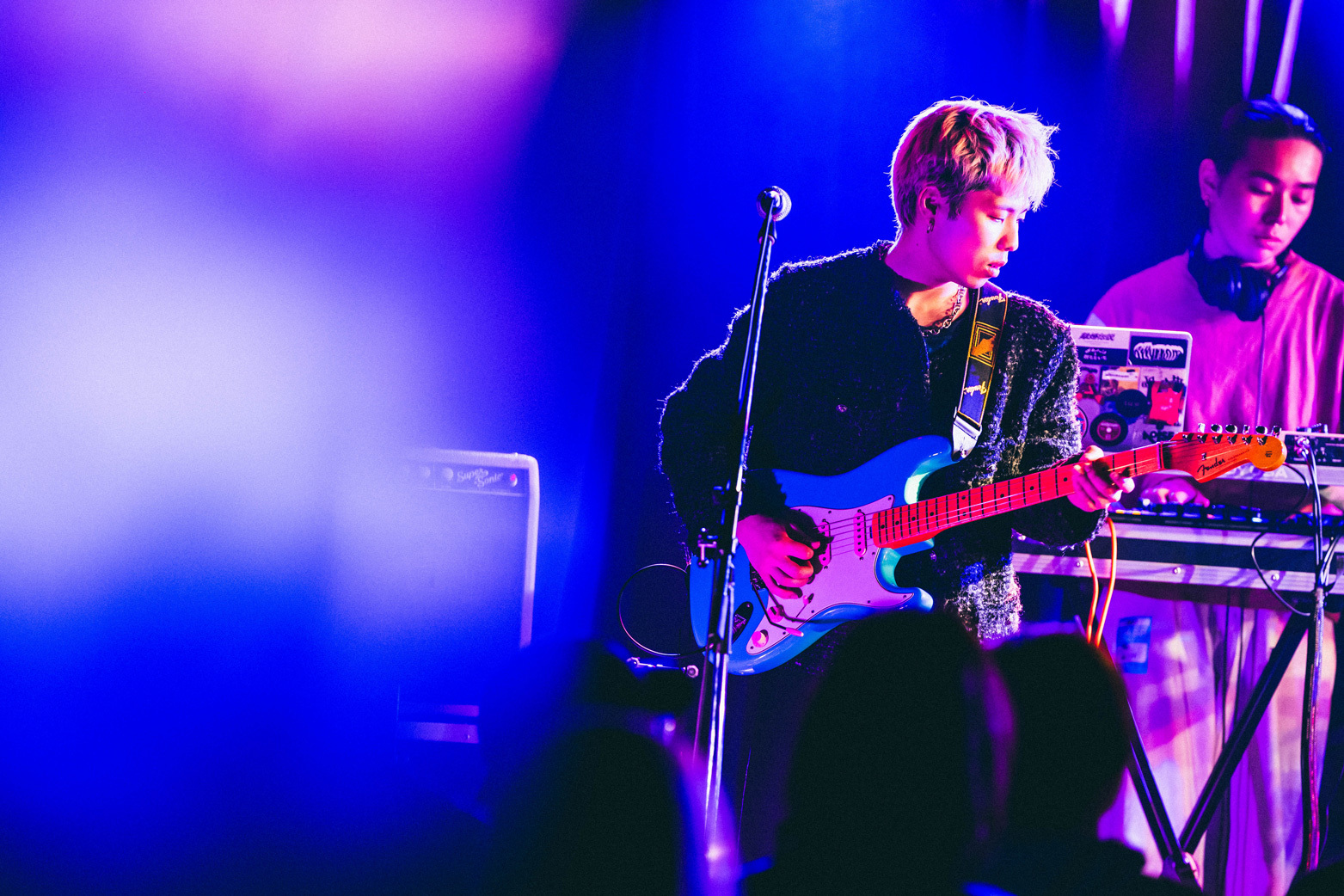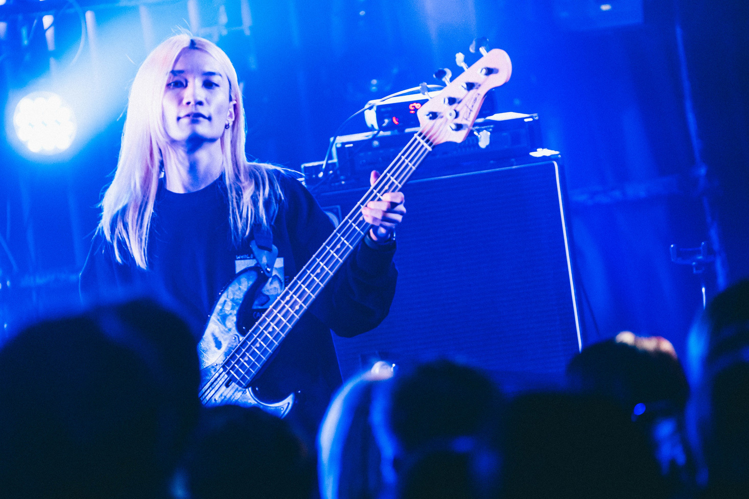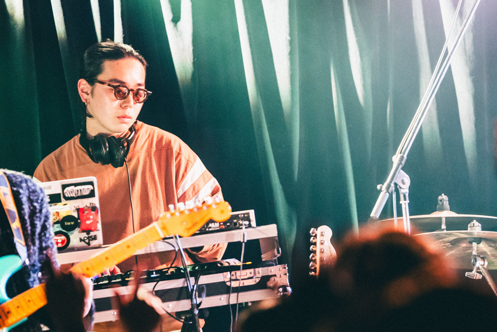 Umeda Zeelaには、2024年1月に活動を開始したばかりのMatty(Vo)、双子のKen_M(Gt)とLyo(Dr) によるノスタルジックモダンロックバンド・LET ME KNOWが、サポートベースに太田あさひを迎えた4人編成で登場。パンパンになったフロアからは、彼らの注目度の高さがうかがえる。SEが流れ、静かにステージの幕が開く。メンバーはグラサンに革ジャンというロックな出で立ちだが、1曲目の「1800」で聴こえてきたギターリフはあまりにキャッチーで、Mattyの歌声は中性的なハスキーボイス。どこか湿度のある日本語ロックは聴けば聴くほど肌馴染みが良く、懐かしさと新しさが同時にやってくる不思議な感覚に陥った。続く「Goodbye Daily」でも、グッドメロディーとジュブナイル感を孕んだ歌詞が、爽やかに駆け抜ける。「バンドマンの元カレ」や「好きなんです」は等身大の若者の恋愛の心情を歌ったJ-POP。Mattyの歌声とそれを支えるバンドサウンドのバランスが絶妙でクセになる。