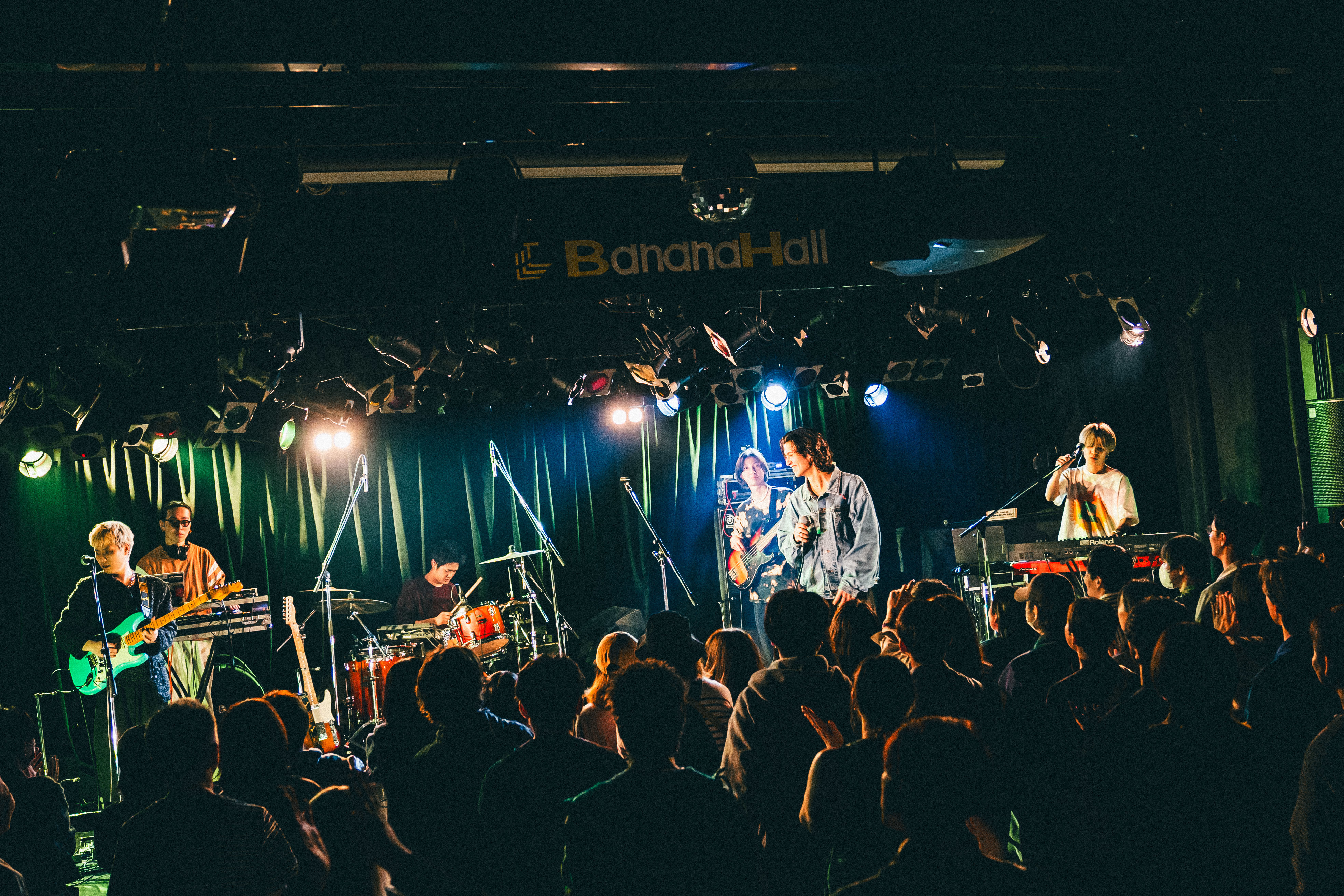 Banana Hallのトリをつとめたのは、2020年に東京・町田で結成されたBillyrrom。Mol(Vo)、Rin(Gt)、Shunsuke(Dr) 、Taiseiwatabiki(Ba) 、Leno(Key.Syn)、Yuta Hara(DJ.MPC)の6人がステージに並ぶとそれだけで存在感がある。まずはバンドセッションでファンキーにフロアを盛り上げる。Molは楽しそうに「自由に楽しんでって!」と叫び、「Defunk」をプレイ。のっけからオーディエンスは手を挙げてダンス!