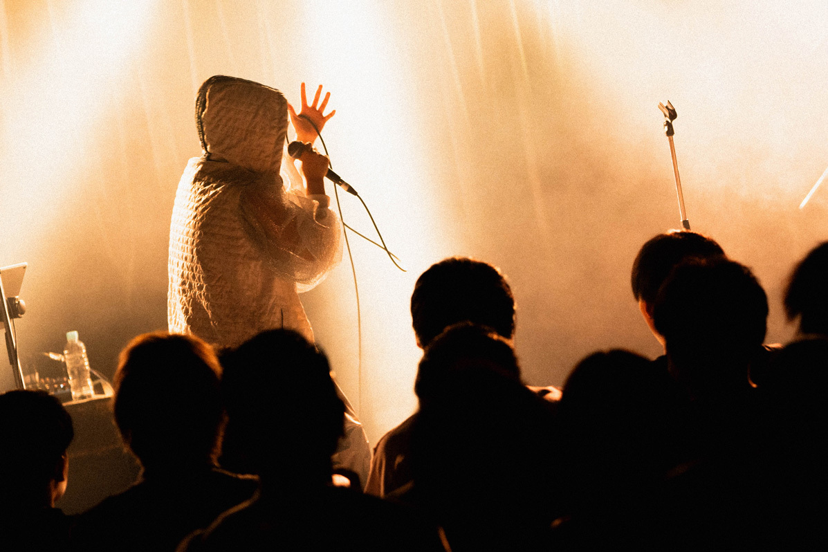 Banana Hallに現れたのはシンガーソングライターの紫 今。すっぽりとフードを被り、SEなしで静かに薄暗いステージに現れると、アカペラで軽くフェイクを響かせる。すーっと息を吸うとベースの低音ラインが鳴り響き、すぐさまフロアからクラップが発生。まずはFM802 2023年12月度邦楽ヘビーローテーション曲の「Not Queen」を妖しくパワフルに歌い上げる。華奢な身体から放たれるシャウトの鋭さと声量にただ圧倒される。彼女が歌いながら空中に手を伸ばすと、シアー素材の衣装の輪郭が逆光の照明に透けて、幻想的な雰囲気を作り出した。続く「ゴールデンタイム」では自らクラップを煽り、「いいねえ皆!」と嬉しそう。ミステリアスでありながら熱量は高く、明るいキャラも垣間見える。ステージを右へ左へ動き回り、ハイトーンボーカルを響かせる度にぞわぞわと鳥肌が立ち、底知れぬ魅力を感じざるを得なかった。