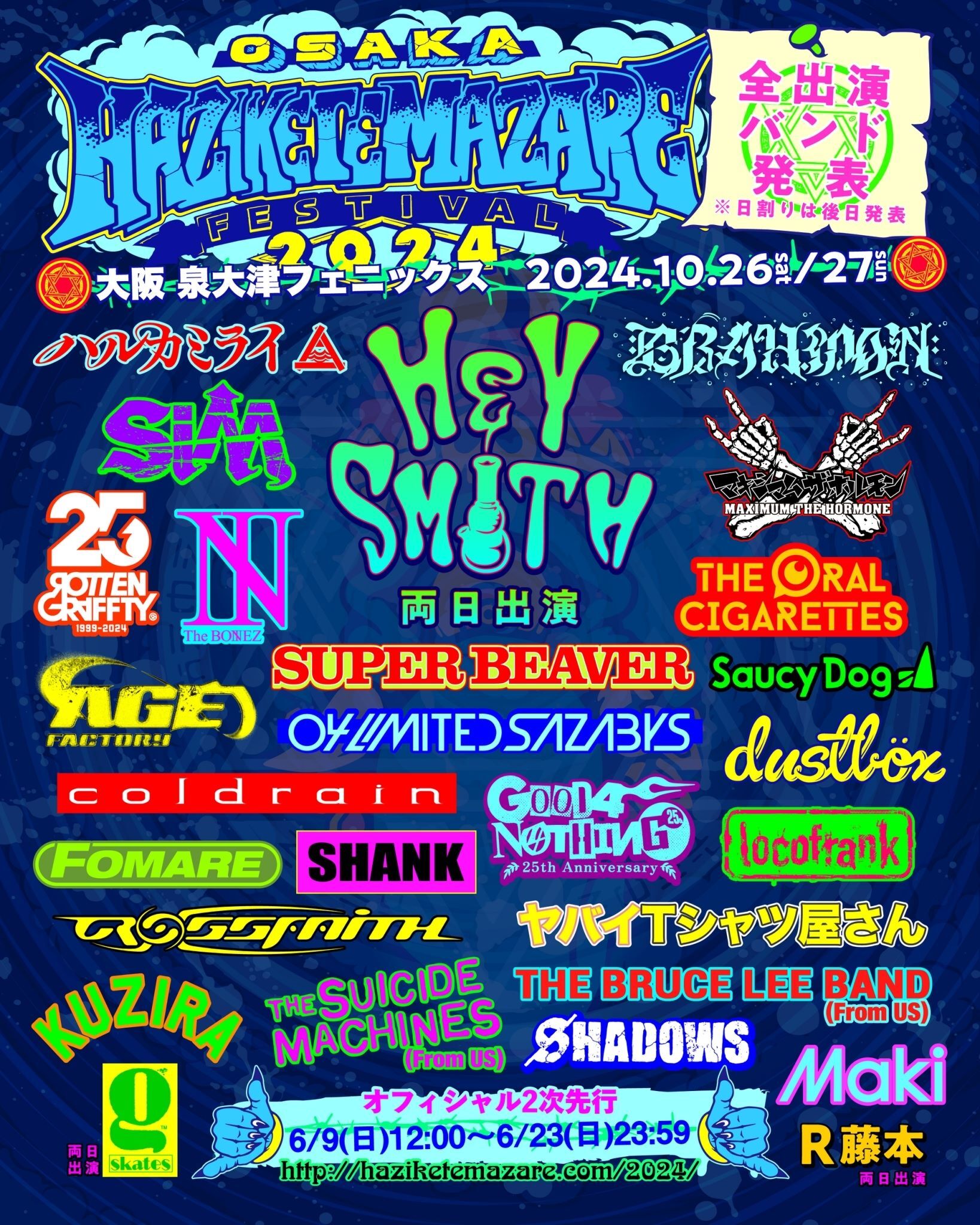 10月26日(土)、27日(日)に泉大津フェニックスにて開催される、HEY-SMITH主催のフェス『HEY-SMITH Presents OSAKA HAZIKETEMAZARE FESTIVAL 2024』の全出演者が一斉発表された。
