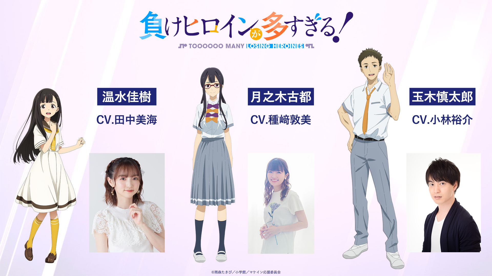 TVアニメ『負けヒロインが多すぎる!』のメインPV、主人公・温水和彦と「負けヒロイン」である八奈見杏菜、焼塩檸檬、小鞠知花が描かれたメインビジュアルが公開された。