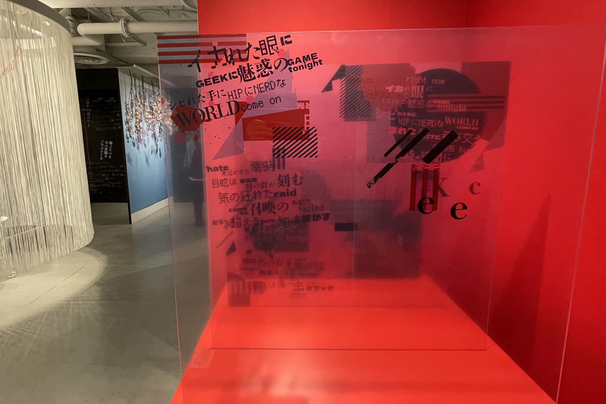 「彼女の“Modern…”」のコーナーはカラフルかつポップで、歌詞が書かれた大型ダイスが。こちらは歌の出だし「ダイスで決める1日の予定は」にちなんだ作品だ。エリア奥にあるのは「everKrack」のコーナーで、赤いアクリル板にハードでスタイリッシュな曲の世界観が再現されていた。