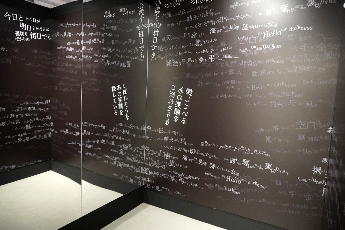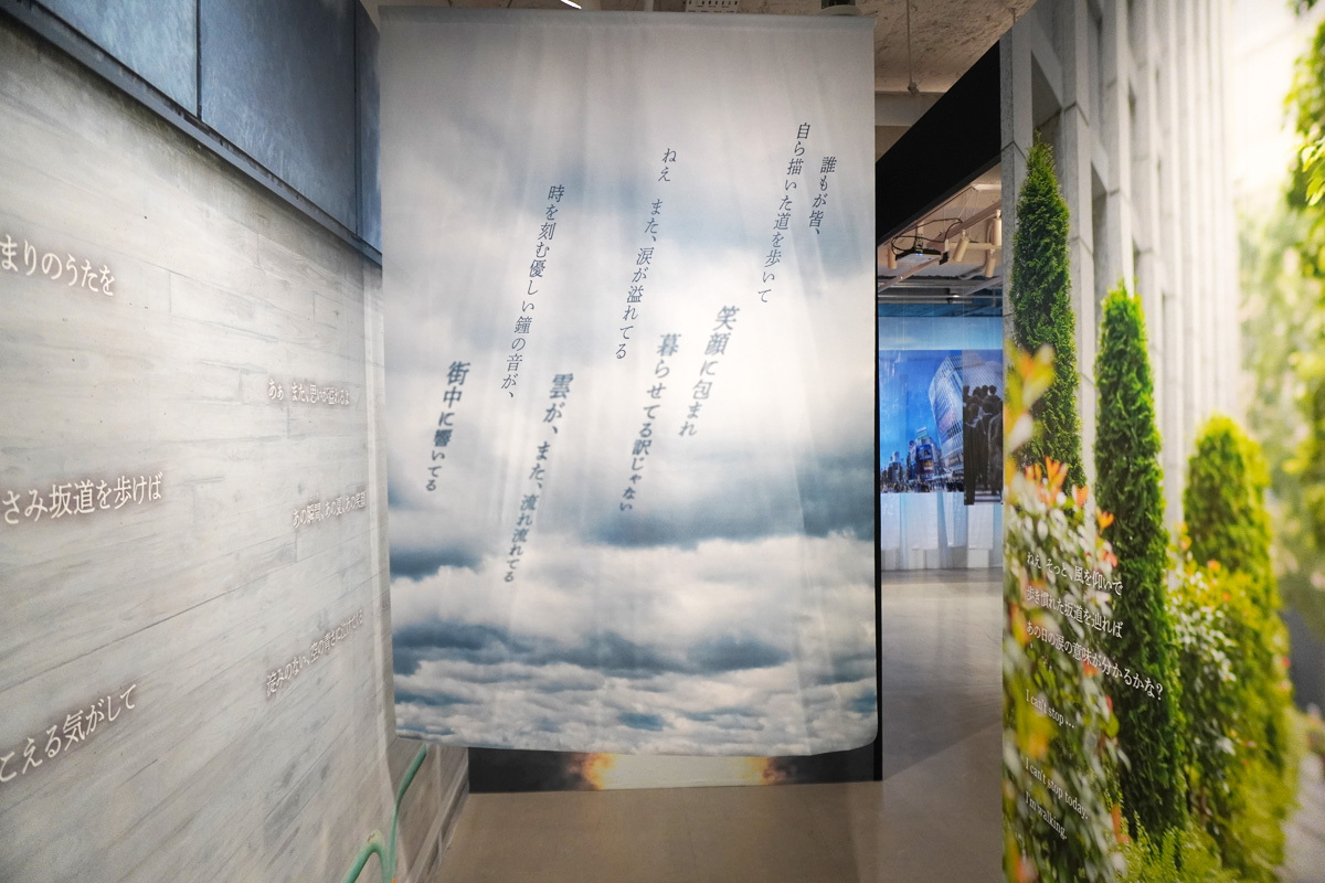 「Songs」エリアでは、GLAYの名曲がインスタレーションになっており、感覚を揺さぶる。最初の「はじまりのうた」のコーナーには歌詞の一部が。鐘の音が聞こえる、エモーショナルな空間だ。