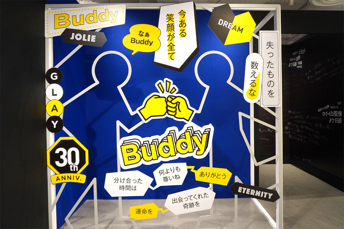 迫力ある文字のデザインが目を惹くのは「MIRROR」で、歌詞の一部が鏡文字になっており、強いインパクトを放つ。続くポップな空間は「Buddy」のコーナーで、メンバーと共に30年間活動してくれたファンもバディと解釈し、二人一組で撮影できるフォトスポットになっている。