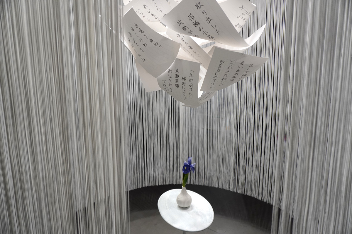 中央でひときわ目立っているのは「あなたといきてゆく」のコーナーだ。白いストリングカーテンをめくると何枚もの便箋と赤い糸が飾られ、アイリスの花がそっと置かれている。