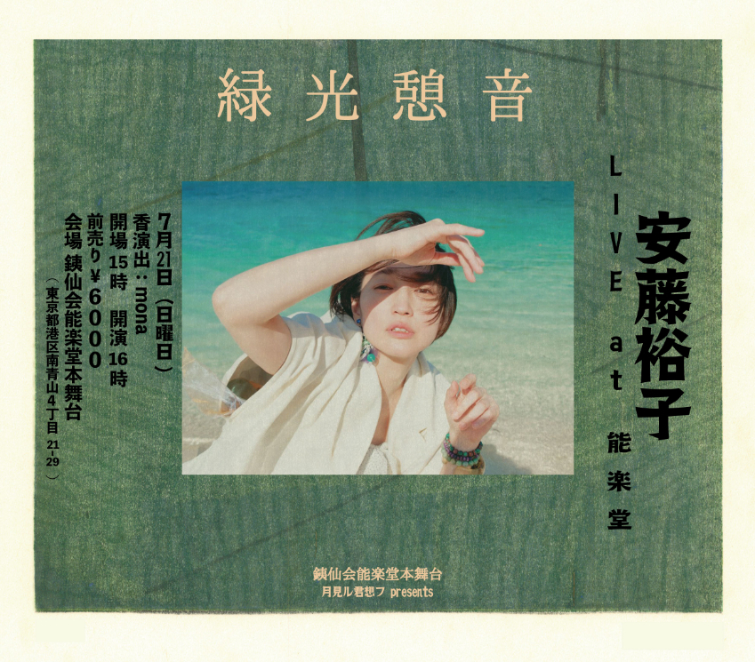 今回の『緑光憩音』は、初日7月21日(日)に安藤裕子が出演。香演出を調香師のmona氏が手がける。