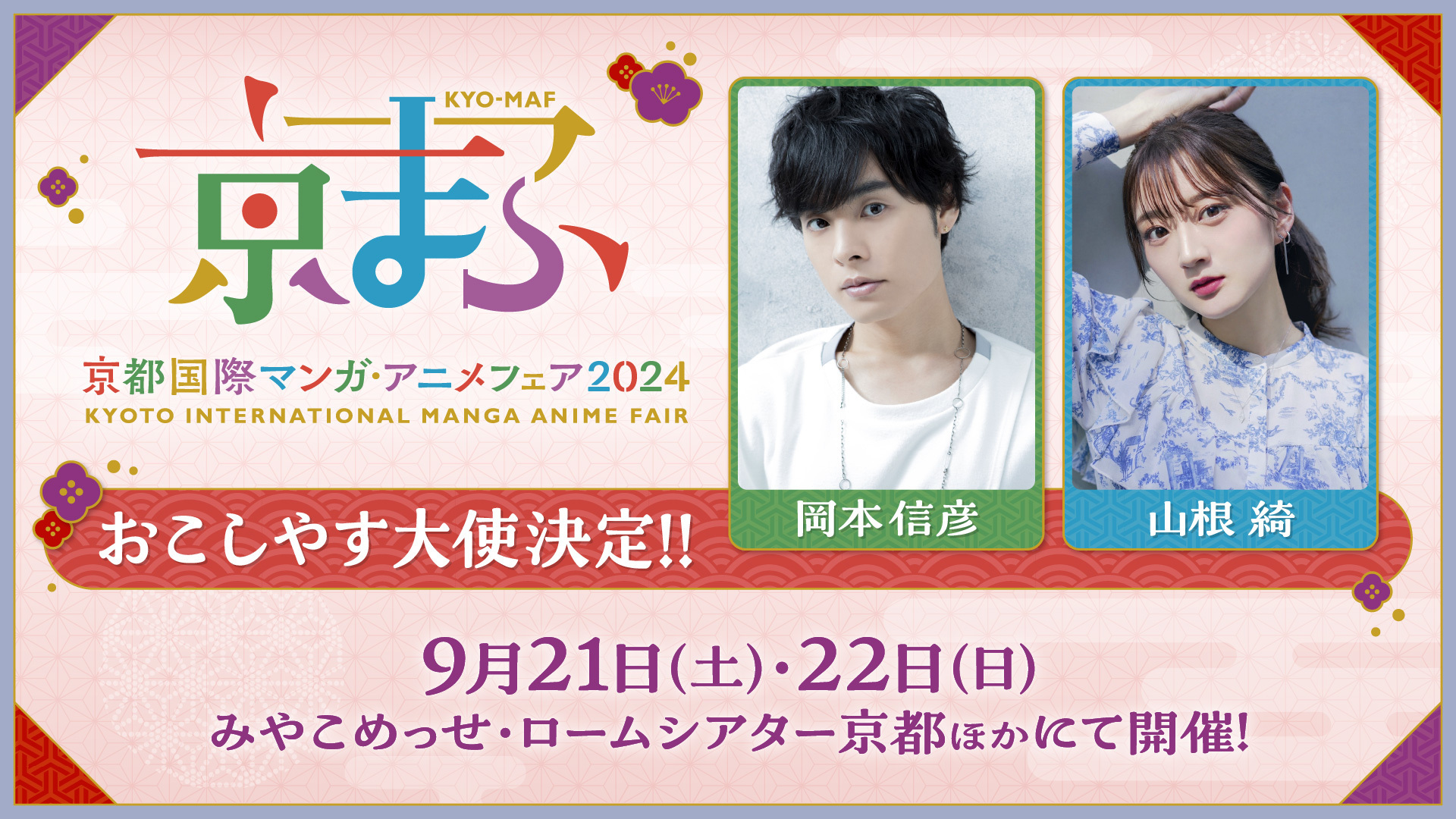 2024年9月21日(土)・22日(日)に京都のみやこめっせ(京都市勧業館)、ロームシアター京都、京都国際マンガミュージアム等で開催される西日本最大級のマンガ・アニメ・ゲームのイベント『京都国際マンガ・アニメフェア(京まふ)2024』のおこしやす大使に、声優の岡本信彦・山根綺の就任が決定したことが発表された。