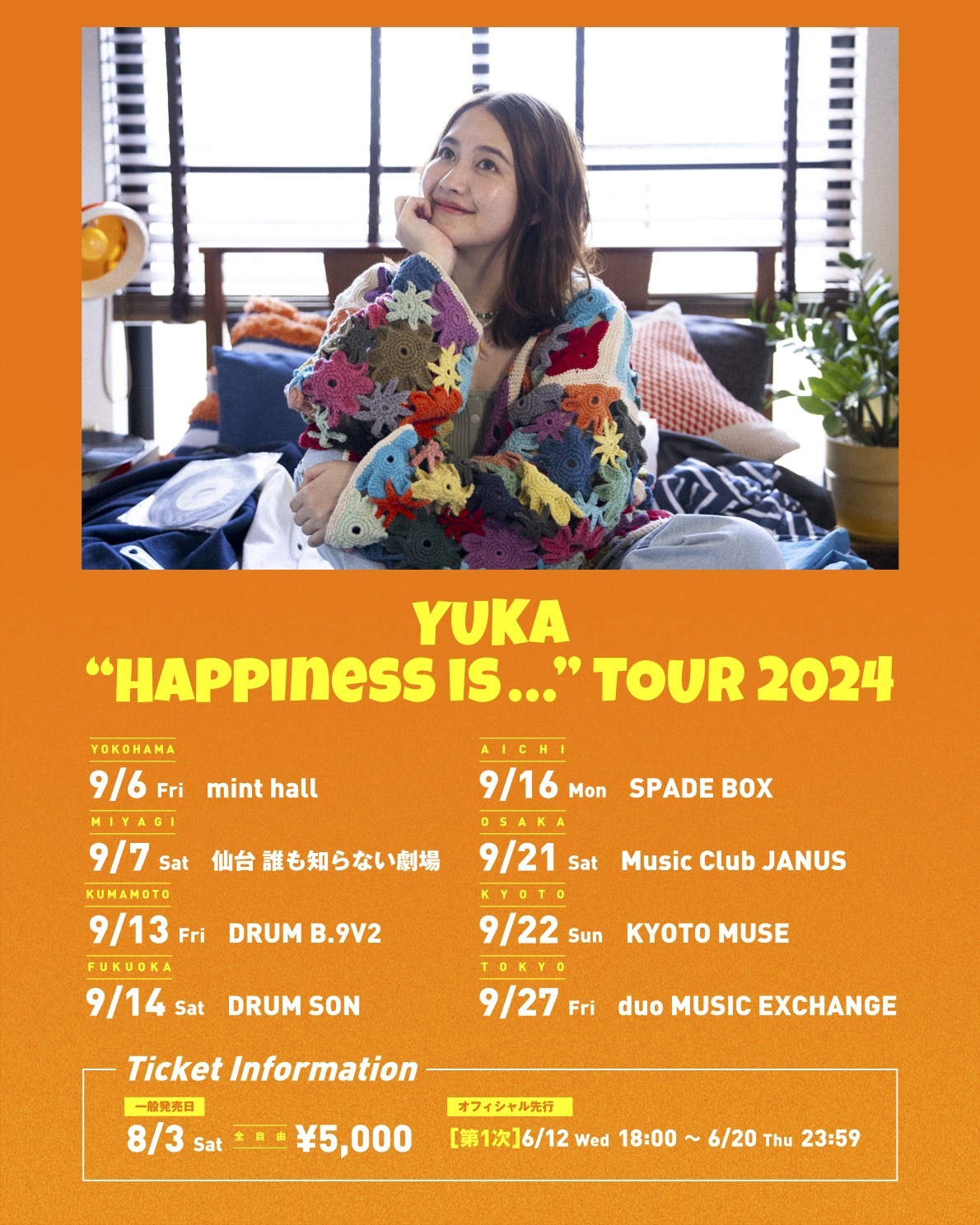 同作を引提げ、横浜公園を皮切り全国8箇所をまわるワンマンツアー『YUKA “Happiness is … ” TOUR 2024』は、全編アコースティック編成。東京、大阪を除くエリアは、2023年2月に開催されたメジャーデビューワンマンツアー以来の1年半ぶりのツアー開催となる。