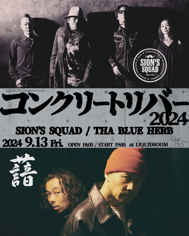 LIQUIDROOMの恵比寿移転20周年を記念した同イベントには、SION率いるSION’S SQUAD(SION/藤井一彦/クハラカズユキ/中西智子)と、THA BLUE HERBが出演する。