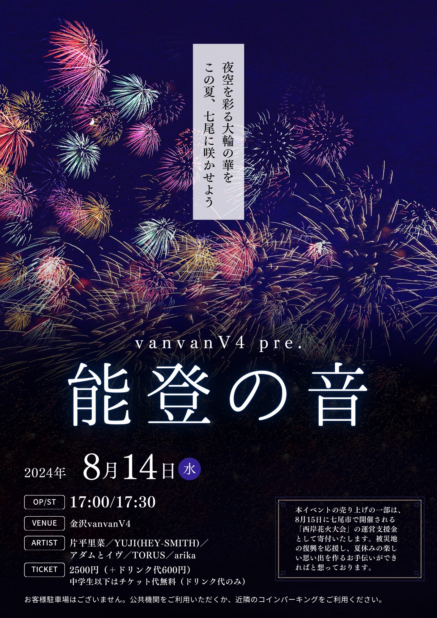 2024年8月14日(水)に、石川県・金沢 vanvanV4にて『能登の音』の開催が発表された。