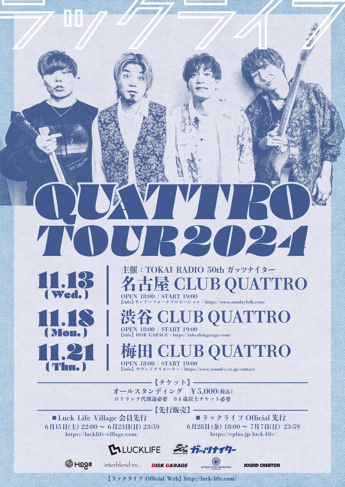 ラックライフが、6月15日・16日の2Daysで今年10回目となる『GOOD LUCK 2024』を地元大阪BIGCATで開催し、Day1のアンコールMCで東名阪『QUATTRO TOUR 2024』の開催を発表した。