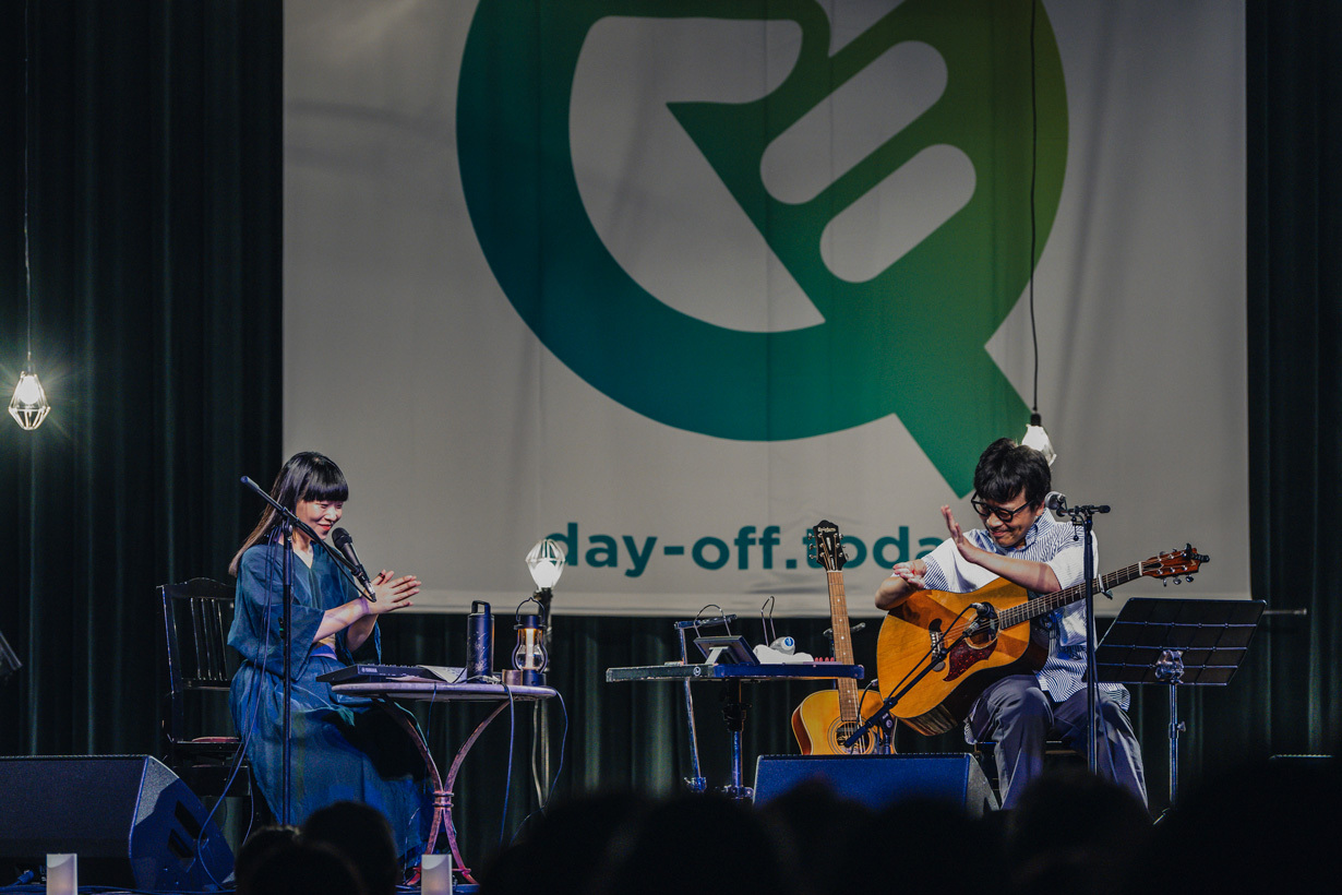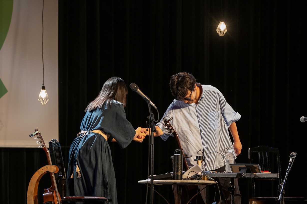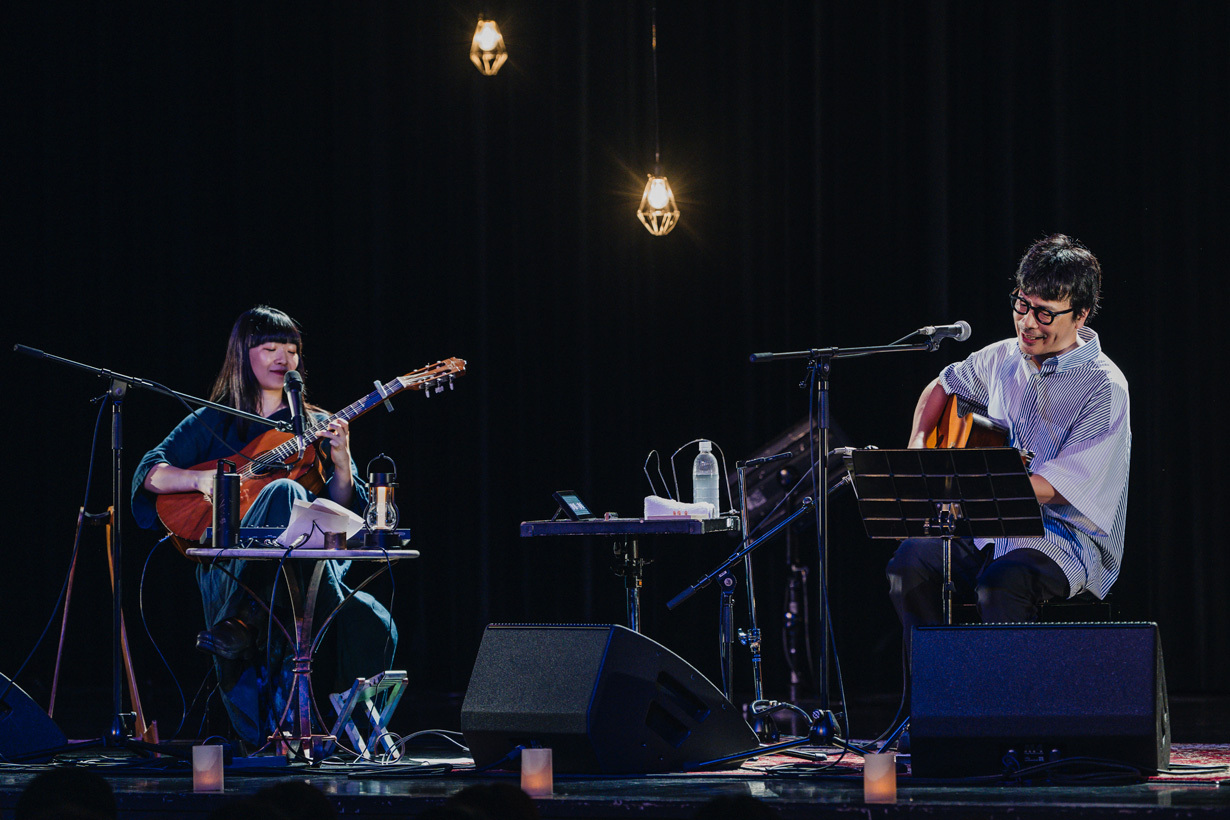 凄まじい2曲で〆られたが、すぐにアンコールの拍手が鳴りやまなくなり、岸田と青葉が笑顔で登場する。沖縄名物タコライスは学生時代にタコが入ったライスだと思っていたという他愛もない話から、いよいよ本題へ。昨日のアンコールセッションが凄かったことを聴いていると青葉が切り出し、岸田も青葉と楽屋で遊んだことはあっても、みなさんの前では初めてですから「表で遊びましょ」とアンコールセッションを始めることに。青葉は電子ピアノで浮遊感ある音色を生み出していき、そこに岸田のギターも爪弾かれていき、くるり「ばらの花」へ。スペシャルなセッションだからこその、ここでしか聴けない演奏。岸田も「これだけで俺、来た甲斐があったわ。めっちゃエエわ!」と大満足する。